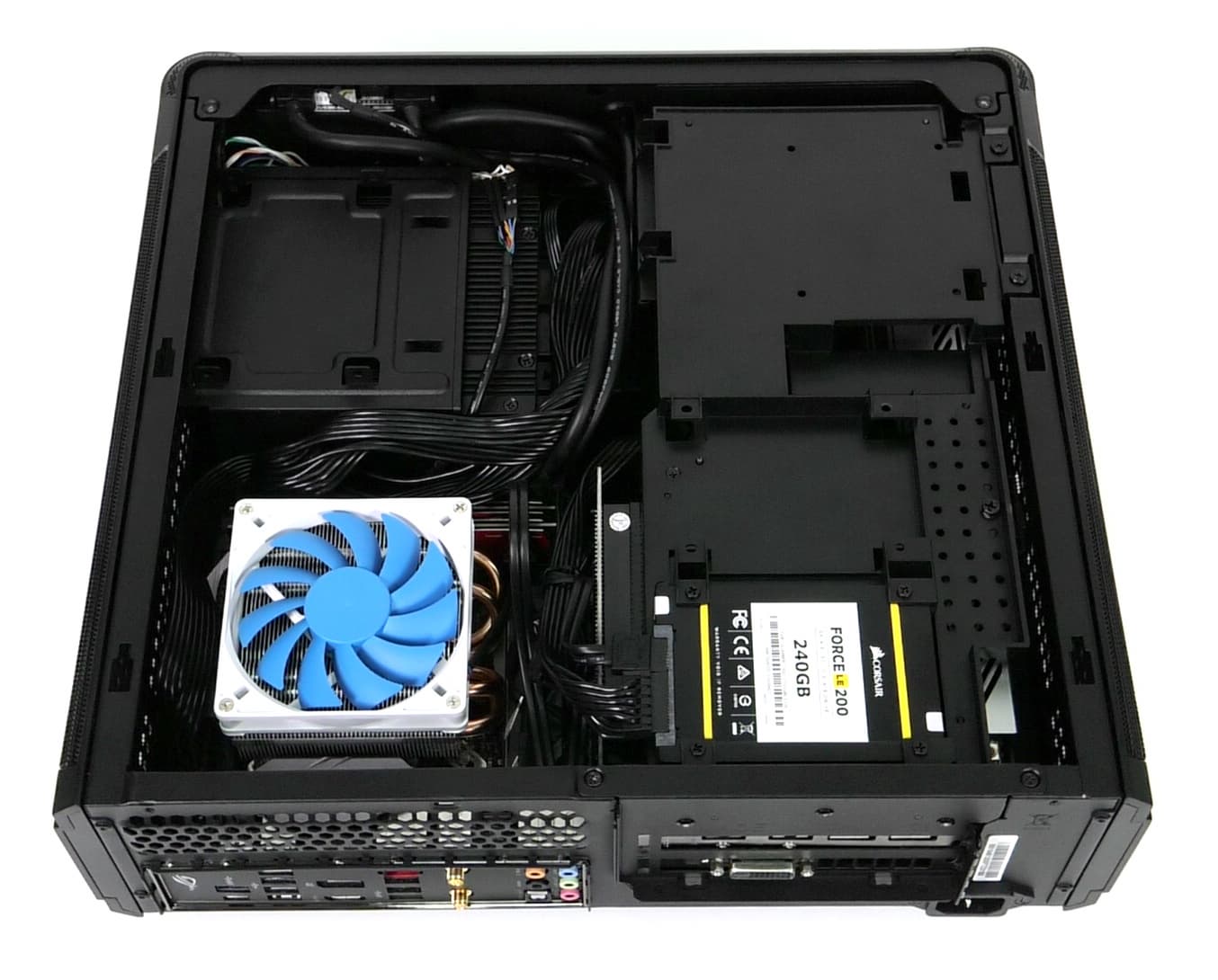 Если смотреть на корпус сверху, то в правой задней части находится место для установки Mini-ITX-платы, а в правой передней — кожух для установки блока питания, который, по совместительству, служит посадочным местом для единственного полноразмерного накопителя.