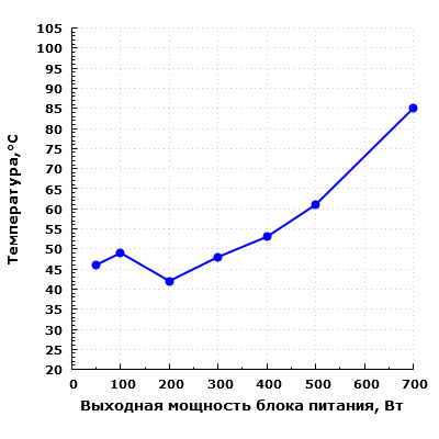 Температура, ожидаемо, заметно выросла и достигла 97 градусов при работе на максимальной мощности. При работе на мощности 500 Вт температура уже вполне удовлетворительная, хотя и тут отмечается рост абсолютных значений. Заметно вырос нагрев компонентов и при работе на мощности 100 Вт, поскольку вентилятор так и не включался.