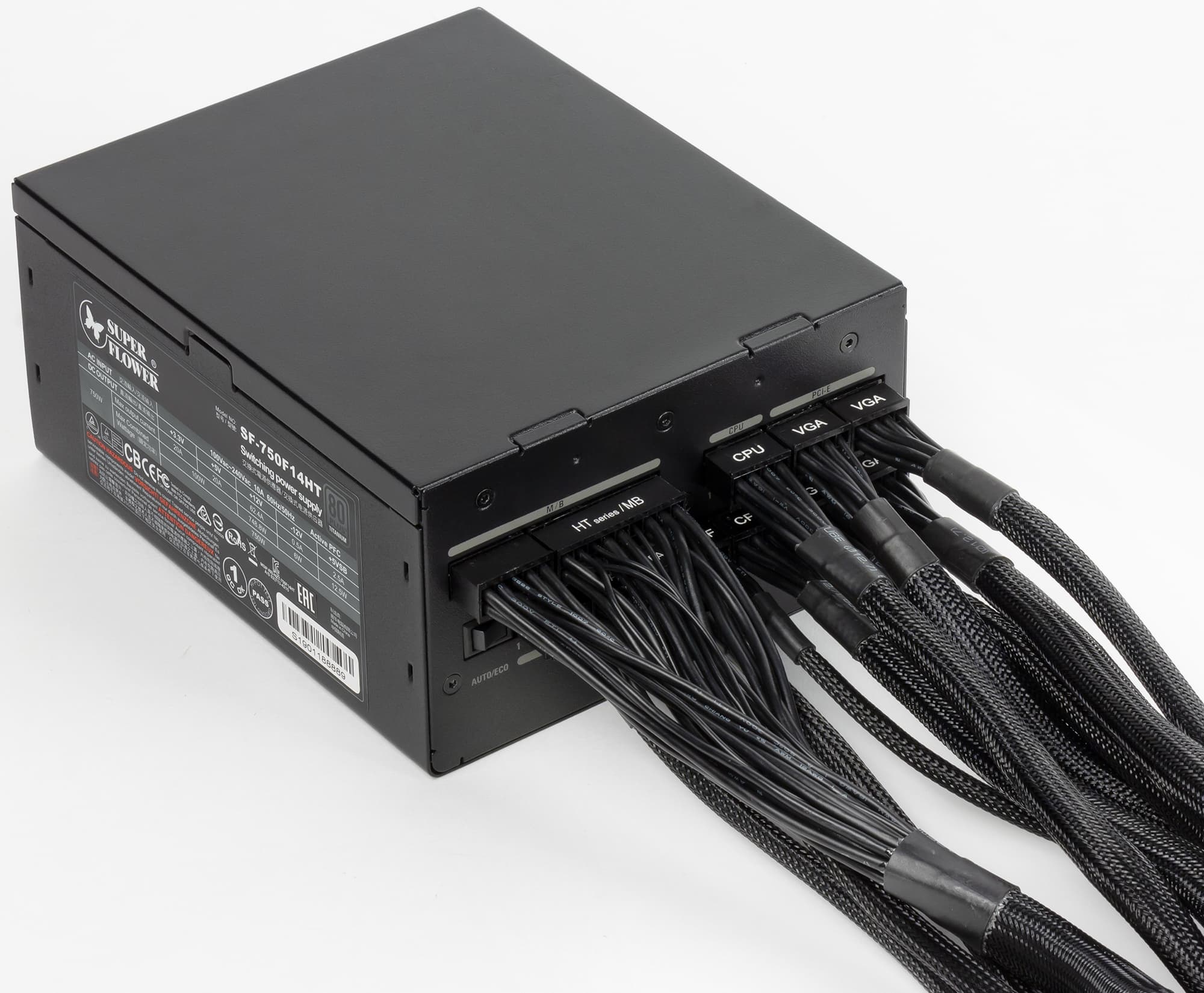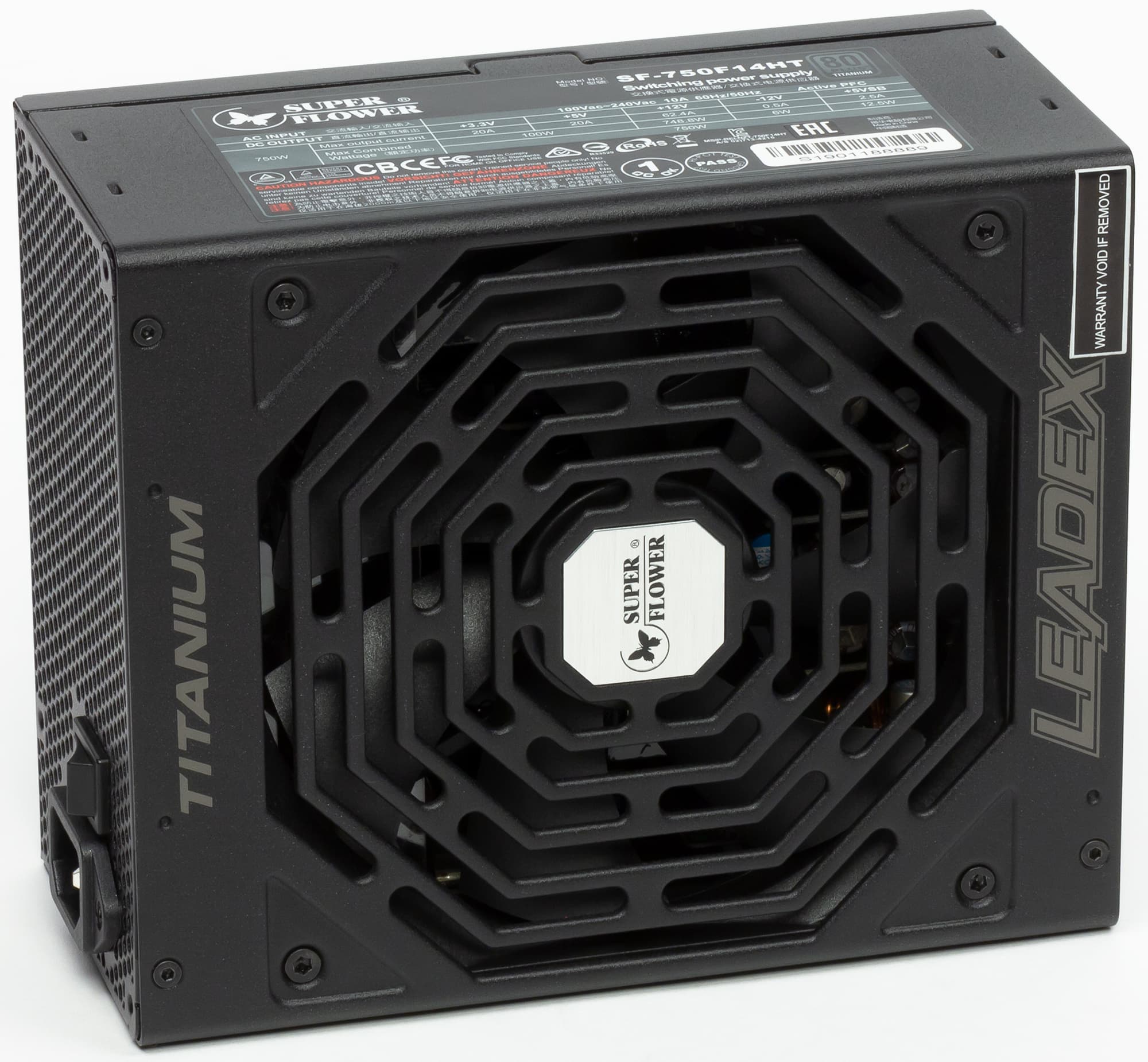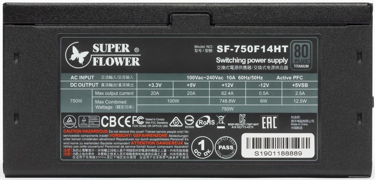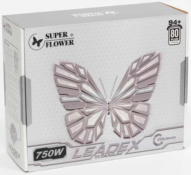 С продукцией под собственной торговой маркой компании Super Flower мы встречаемся редко — за последние годы нам довелось тестировать лишь по-настоящему топовый Leadex Titanium 1600W. Также мы время от времени тестируем OEM-продукцию Super Flower, в том числе под маркой Chieftec. Сегодня у нас на тестах очередная разработка компании с бабочкой на борту — Leadex Titanium 750W (SF-750F14HT). Дизайн коробки решен в бело-серой гамме, что, видимо, символизирует наличие у данного продукта сертификата 80Plus Titanium. К сожалению, ручки для переноски тут нет, и подобная ситуация вполне типична для современных блоков питания независимо от их веса.