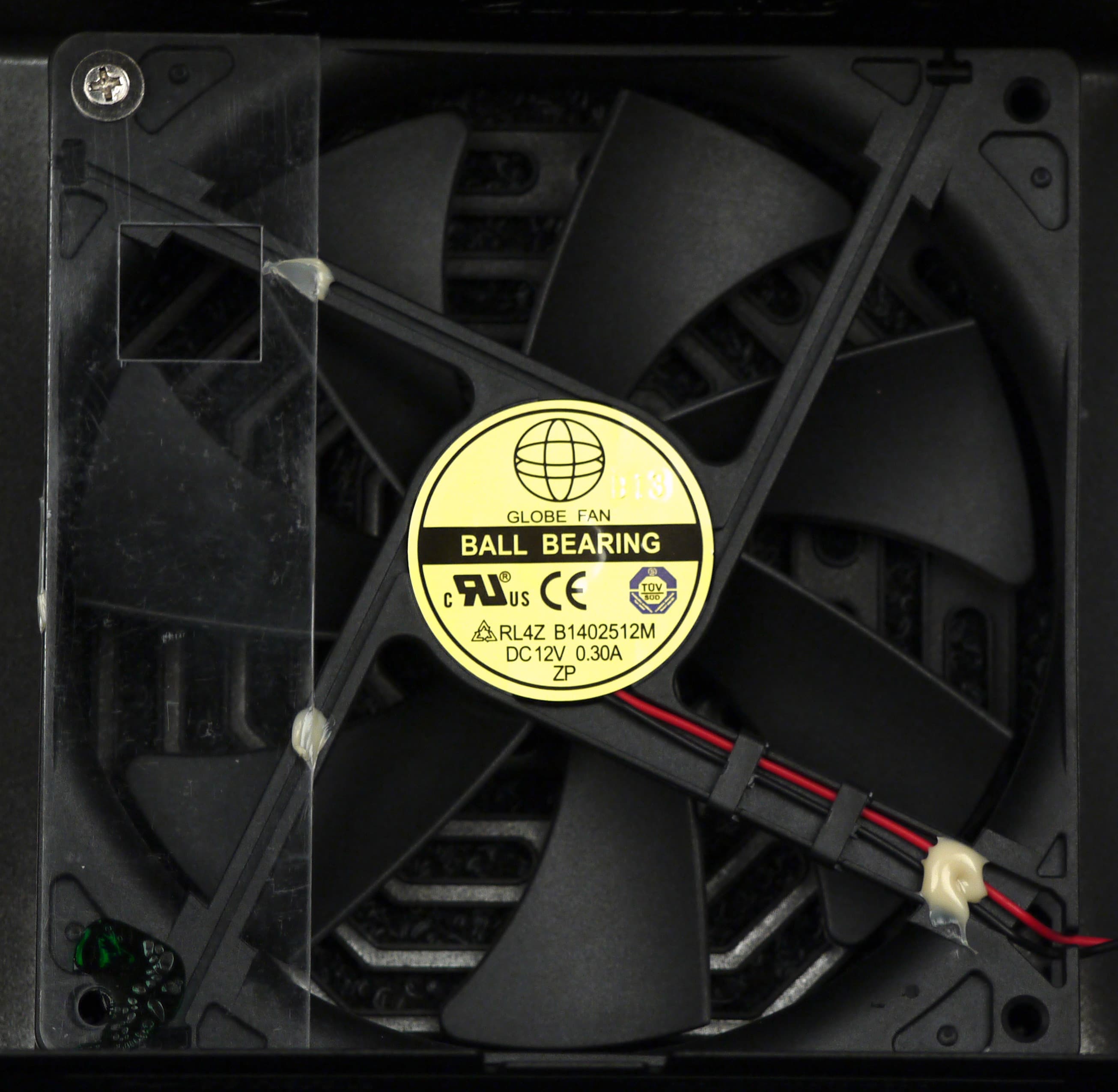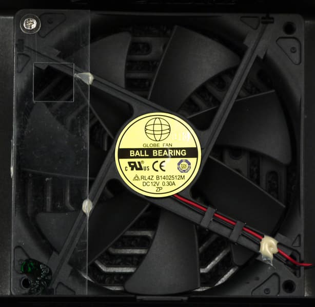 Под штампованной решеткой установлен вентилятор RL4ZB1402512M типоразмера 140 мм производства Globe Fan. Данная модель вентилятора основана на подшипнике качения и имеет максимальную скорость вращения 1200 об/мин. Подключение разъемное двухпроводное.