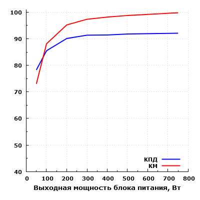 Эффективность БП находится на высоком уровне. Согласно нашим измерениям, КПД данного блока питания достигает значения свыше 91% в диапазоне мощности от 300 до 750 ватт. Максимальное зарегистрированное значение составило 92,1% на мощности 750 Вт. Одновременно с этим, КПД на мощности 50 Вт составил 78,3%.