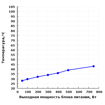 Также стоит учитывать, что в случае работы с остановленным вентилятором температура компонентов внутри БП сильно зависит от окружающей температуры воздуха, и если та установится на уровне 40-45 °C, это приведет к более раннему включению вентилятора.
