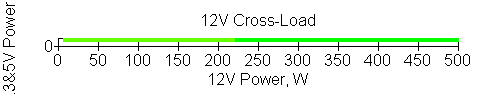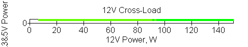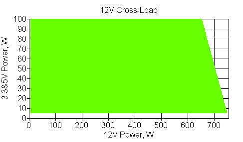 Следующим этапом инструментального тестирования является построение кросснагрузочной характеристики (КНХ) и представление ее на четвертьплоскости, ограниченной максимальной мощностью по шине 3,3&5 В с одной стороны (по оси ординат) и максимальной мощностью по шине 12 В с другой (по оси абсцисс). В каждой точке измеренное значение напряжения обозначается цветовым маркером в зависимости от отклонения от номинального значения.