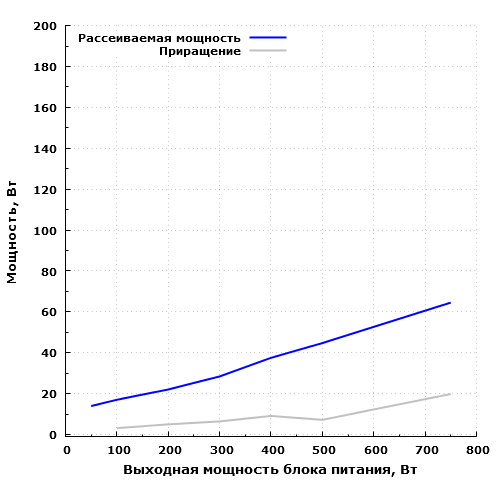Экономичность модели находится на очень высоком уровне: на максимальной мощности БП рассеивает около 64,5 Вт, 60 Вт он рассеивает на мощности порядка 700 Вт. На мощности 50 Вт блок питания рассеивает около 13,9 Вт.