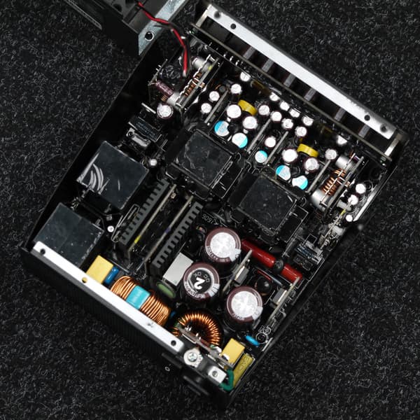 Размещение силовых полупроводниковых элементов вполне соответствует современным тенденциям: основная их масса размещена на дочерних платах, которые установлены вертикально. Ясно, что разработчики рассчитывали на получение максимального эффекта от конвекции, так как блок питания поддерживает режим работы с остановленным вентилятором, в котором данный эффект весьма востребован. Также во внутреннем объеме блока питания минимизировано количество проводных соединений — налицо оптимизация воздушных потоков, которая также призвана улучшить охлаждение элементов во время работы.