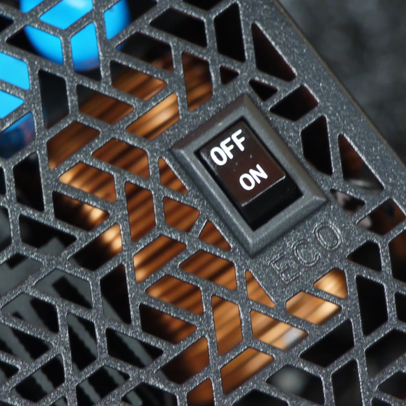 Дизайн этого блока питания выглядит весьма органично. Однако применение штампованной решетки с трапециевидным рисунком над вентилятором чревато повышенным уровнем шума при работе, да пыль на такой решетке будет оседать активнее. Сейчас тенденция такова, что штампованные решетки применяются всё чаще и чаще, поскольку они, видимо, проще в изготовлении, а БП с такими решетками чуть дешевле в производстве.