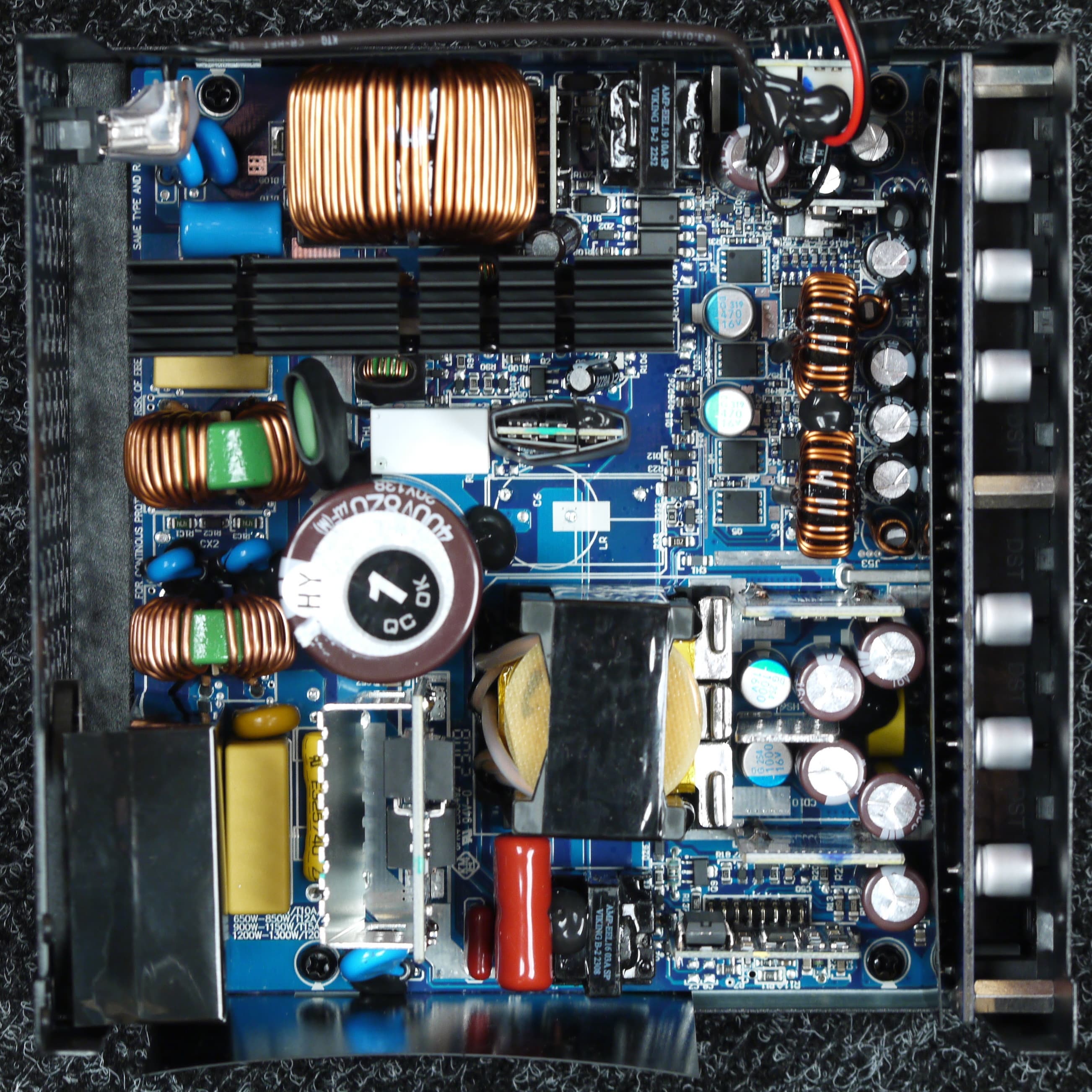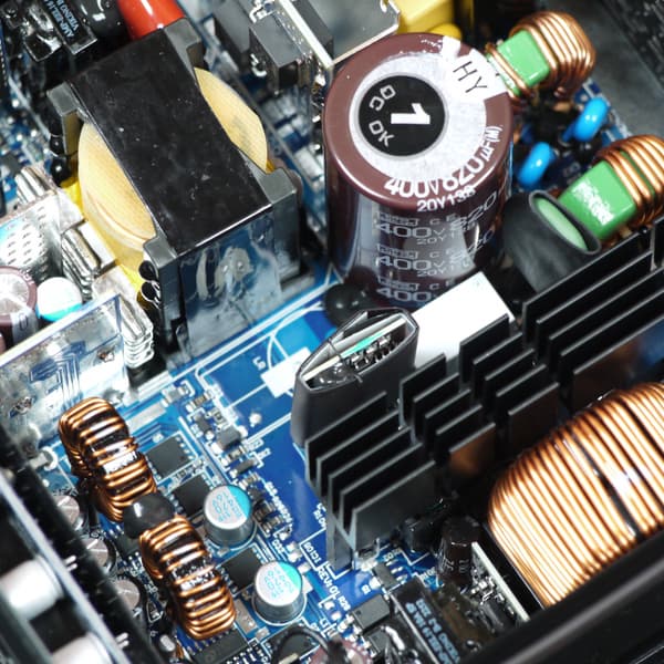 Конструкция блока питания вполне соответствует современным тенденциям: активный корректор коэффициента мощности, синхронный выпрямитель для канала +12VDC, независимые импульсные преобразователи постоянного тока для линий +3.3VDC и +5VDC.