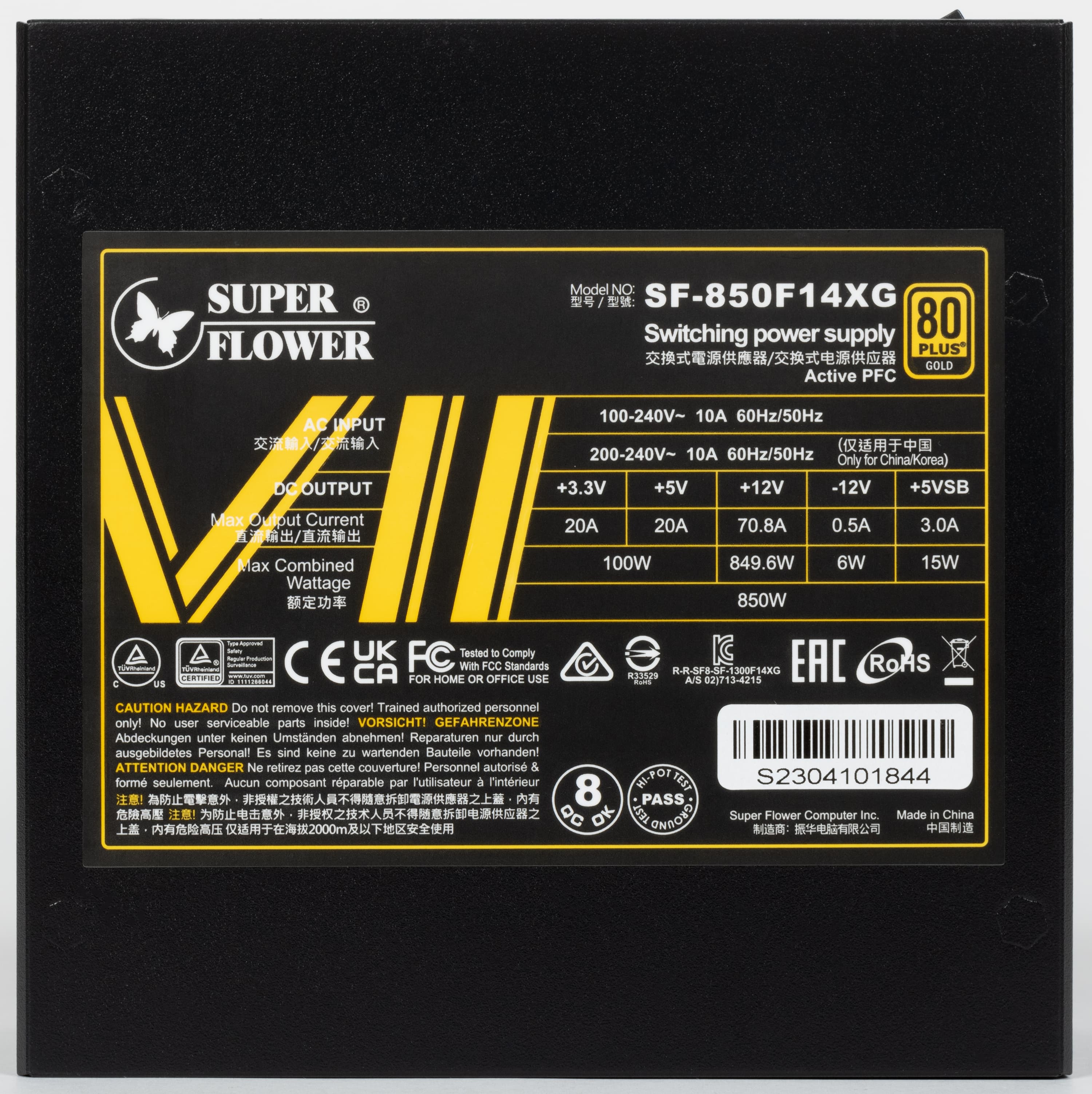 Все необходимые параметры указаны на корпусе блока питания в полном объеме, для мощности шины +12VDC заявлено значение 850 Вт. Соотношение мощности по шине +12VDC и полной мощности составляет практически 100% (99,95%), что, разумеется, является отличным показателем.