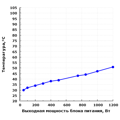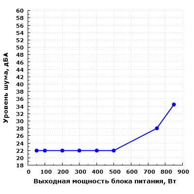При дальнейшем увеличении выходной мощности уровень шума заметно повышается, но даже при работе на мощности 750 Вт шум блока питания находится на пониженном уровне для жилого помещения в дневное время суток — около 29 дБА с расстояния 0,35 метра.