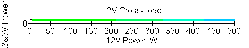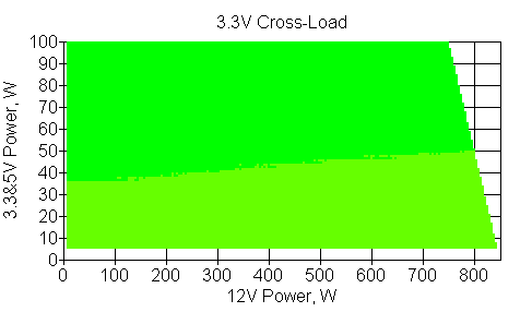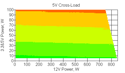 Следующим этапом инструментального тестирования является построение кросснагрузочной характеристики (КНХ) и представление ее на четвертьплоскости, ограниченной максимальной мощностью по шине 3,3&5 В с одной стороны (по оси ординат) и максимальной мощностью по шине 12 В с другой (по оси абсцисс). В каждой точке измеренное значение напряжения обозначается цветовым маркером в зависимости от отклонения от номинального значения.