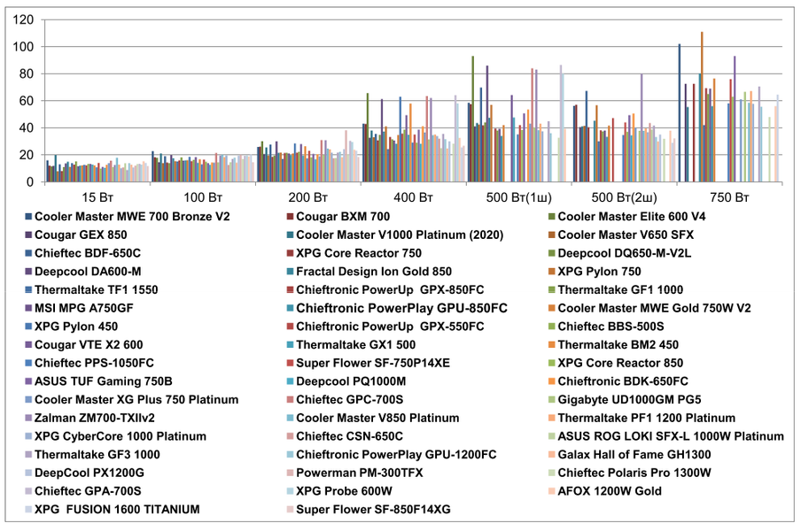 | Cooler Master MWE Bronze 750W V2 | 15,9 | 22,7 | 25,9 | 43,0 | 58,5 | 56,2 | 102,0 |