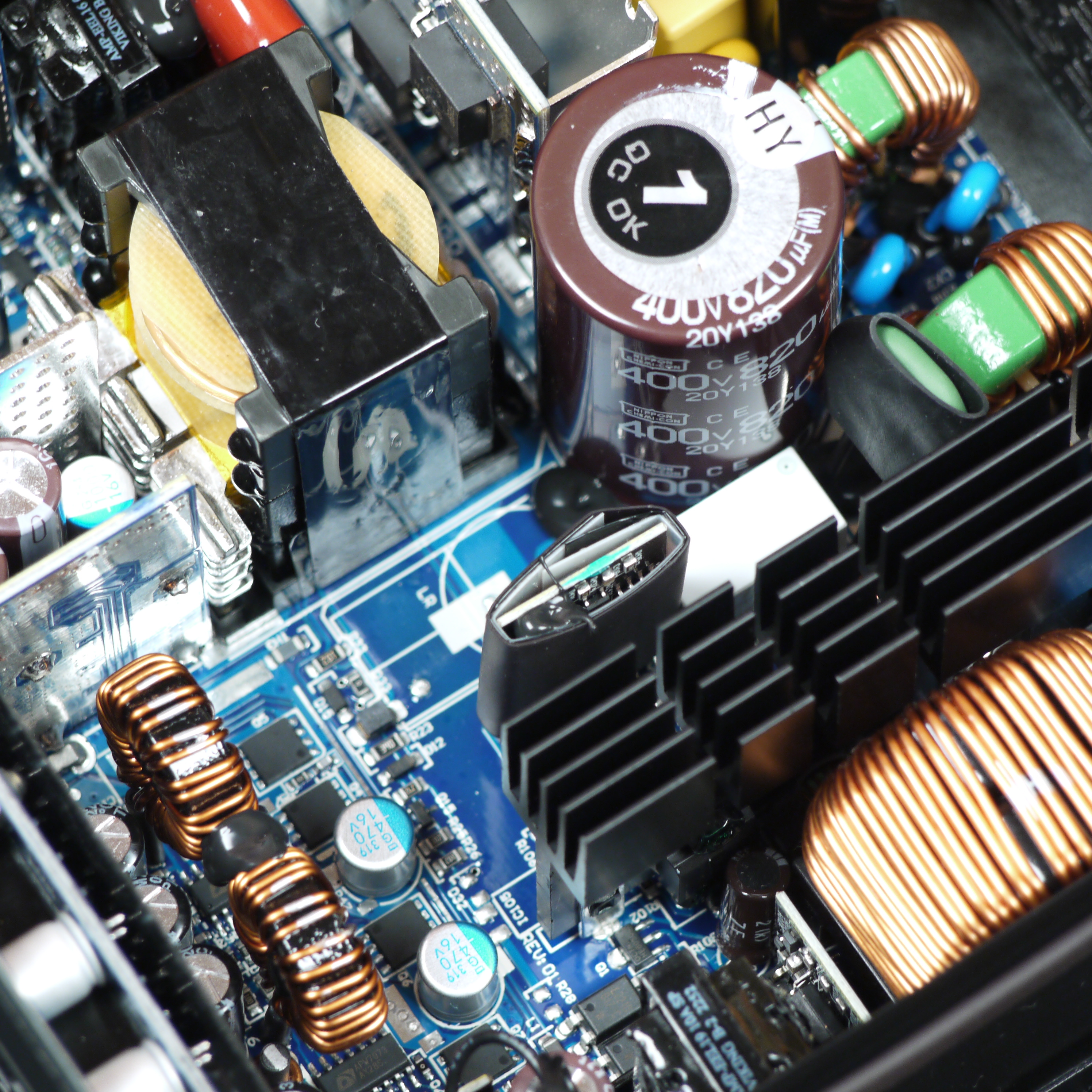 В целом всё очень здорово. Акустическая эргономика БП до 500 Вт включительно очень хорошая, до 850 Вт включительно — просто хорошая, а до 200 Вт этот БП может долговременно работать с остановленным вентилятором. Отметим высокую нагрузочную способность платформы по каналу +12VDC, а также высокое качество питания отдельных компонентов и высокую экономичность. Существенных недостатков наше тестирование не выявило. Блок питания комплектуется японскими конденсаторами, а также вентилятором с гидродинамическим подшипником. Длина проводов у БП достаточная для большинства применений, к тому же провода использованы полностью съемные.