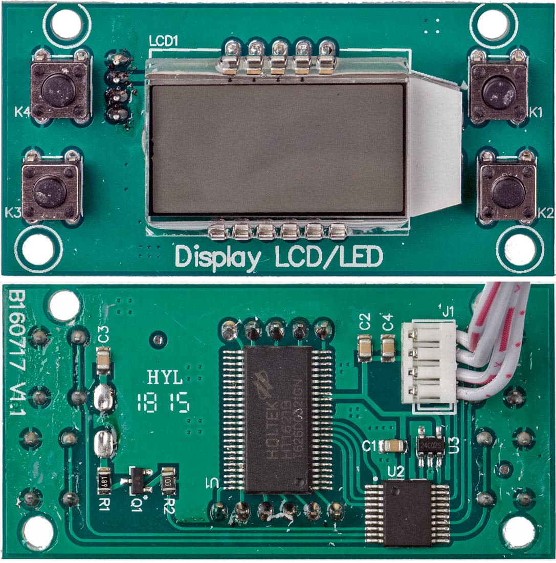 Плата RN-16D сложнее: помимо такого же микроконтроллера, имеются ИМС-драйвера ЖК-панели и энергонезависимой памяти. Шлейф в этой модели имеет разъемы на обоих концах, но в нашем экземпляре не мешало бы тщательнее удалить остатки флюса (вполне возможно, что в обновленной версии это уже сделано).