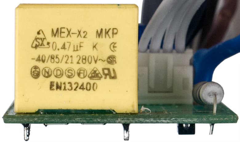 А в новом варианте конденсатор выбран с большим запасом по напряжению — на 630 В, но уже без «Х2». Надо заметить, что номинальное напряжение конденсатора — это максимально допустимое значение для постоянного тока, а для синуса в сети переменного тока его нужно, как минимум, разделить на квадратный корень из 2, то есть в данном случае получится примерно 445 В, чего вполне достаточно, даже если напряжение в сети повысится до 380-400 В (поданы две фазы вместо фазы и нейтрали).