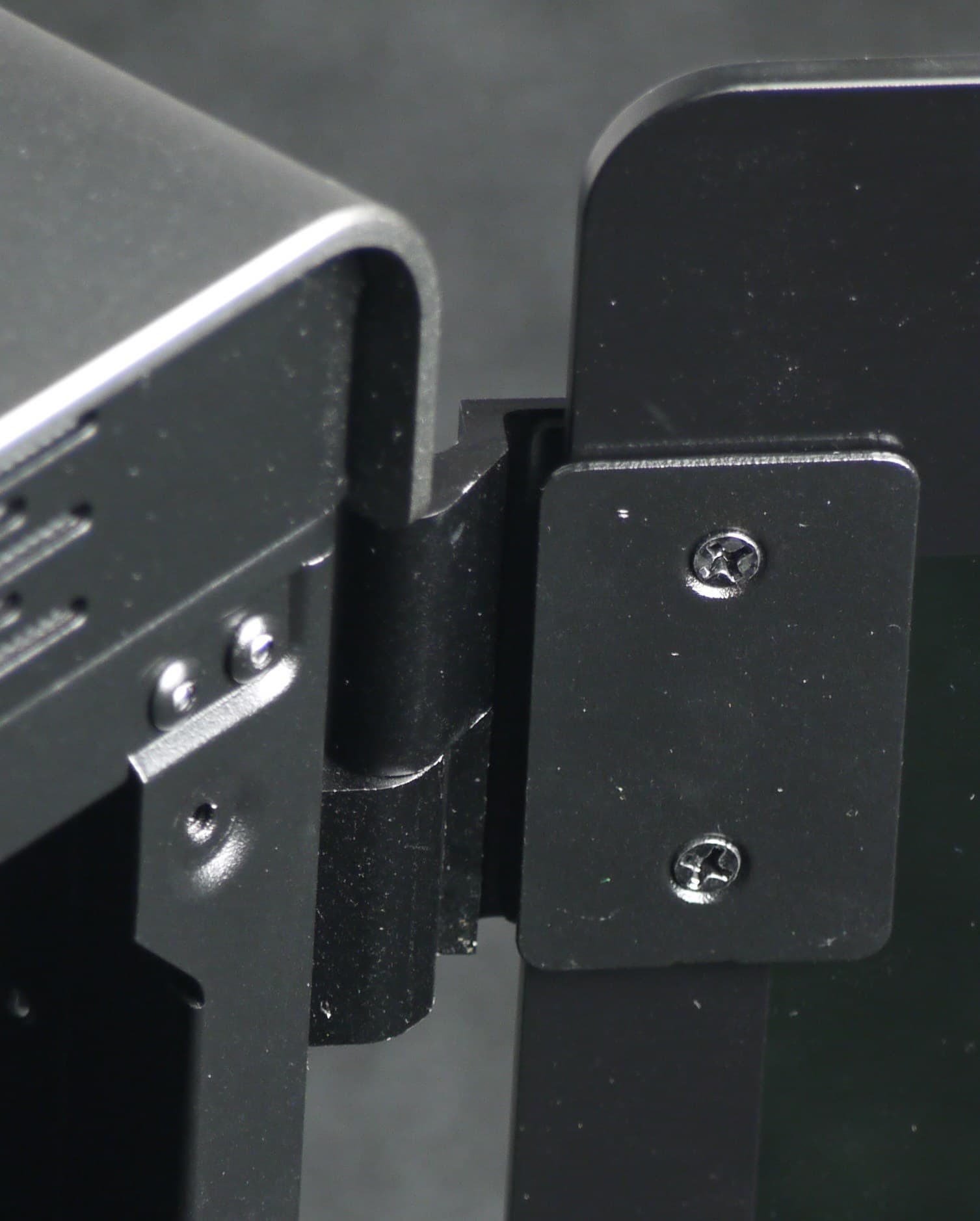 Передняя и верхняя панели имеют схожую конструкцию, представляющую собой комбинацию из стальной рамы и накладки из алюминиевого сплава. Крепление панелей осуществляется стандартным способом — за счет распорных элементов конусной формы, которые вставляются в соответствующие отверстия в шасси. Ничего откручивать тут не надо.
