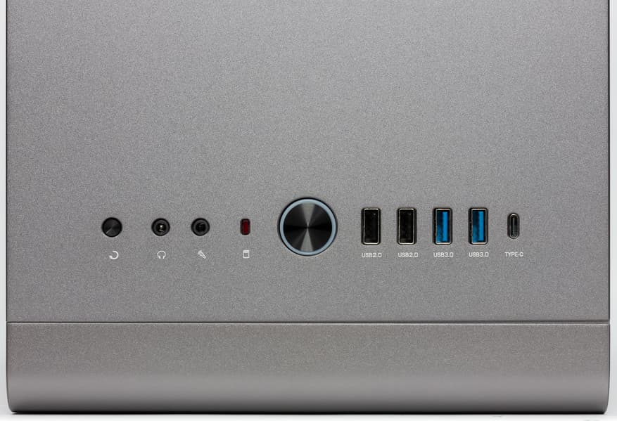 Органы управления и коммутации размещены на верхней стенке корпуса в передней ее части. Они представлены внушительным набором: два порта USB 3.0, два порта USB 2.0, один порт USB 3.0 Type-C и два аудиоразъема (для наушников и микрофона). Расстояние между портами USB такое, что позволяет использовать как минимум пару широких устройств. Также тут присутствуют кнопка включения с опоясывающим индикатором питания голубого цвета, индикатор активности накопителей красного цвета и кнопка перезагрузки.