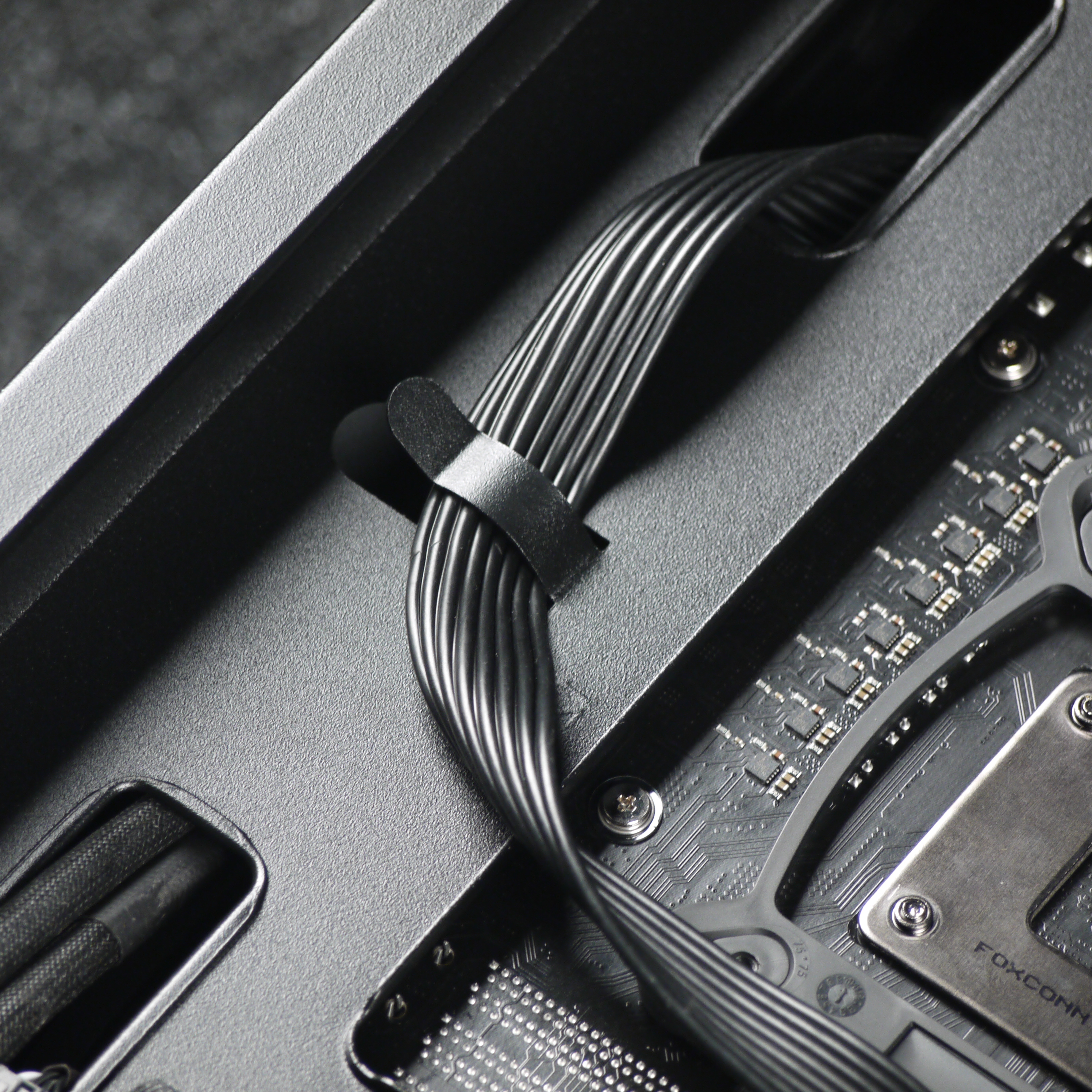Для монтажа проводов предусмотрены петли для крепления стяжек или других аналогичных изделий. В монтажных отверстиях установлены лепестковые мембраны. Также в корпусе предустановлено несколько многоразовых нейлоновых стяжек с застежками-липучками, что облегчает сборку системного блока.