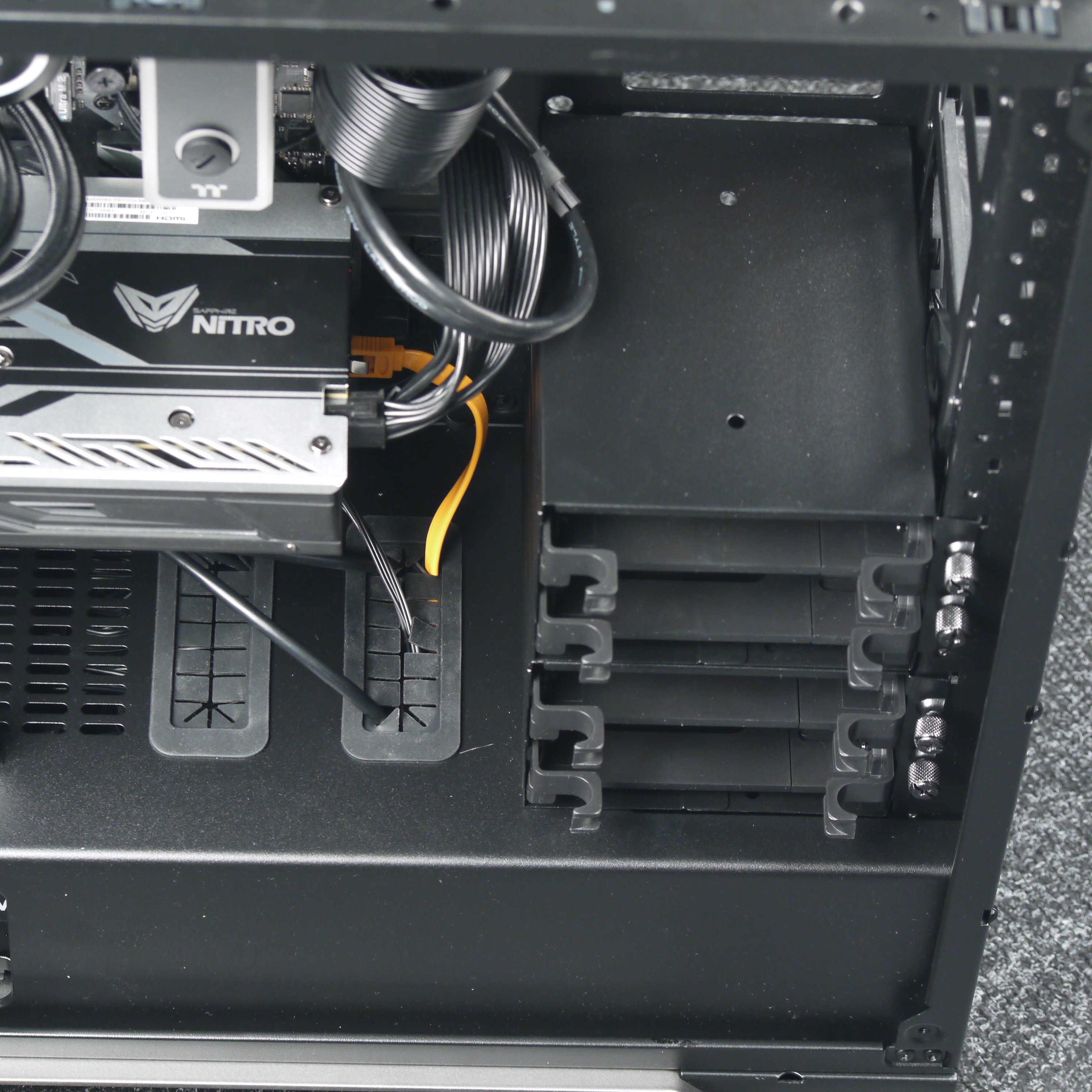 Верхний отсек состоит из двух частей, каждая из которых рассчитана на установку двух накопителей, при необходимости можно демонтировать любую из них или обе. Нижний отсек имеет аналогичную конструкцию и представляет собой половину от верхнего отсека.