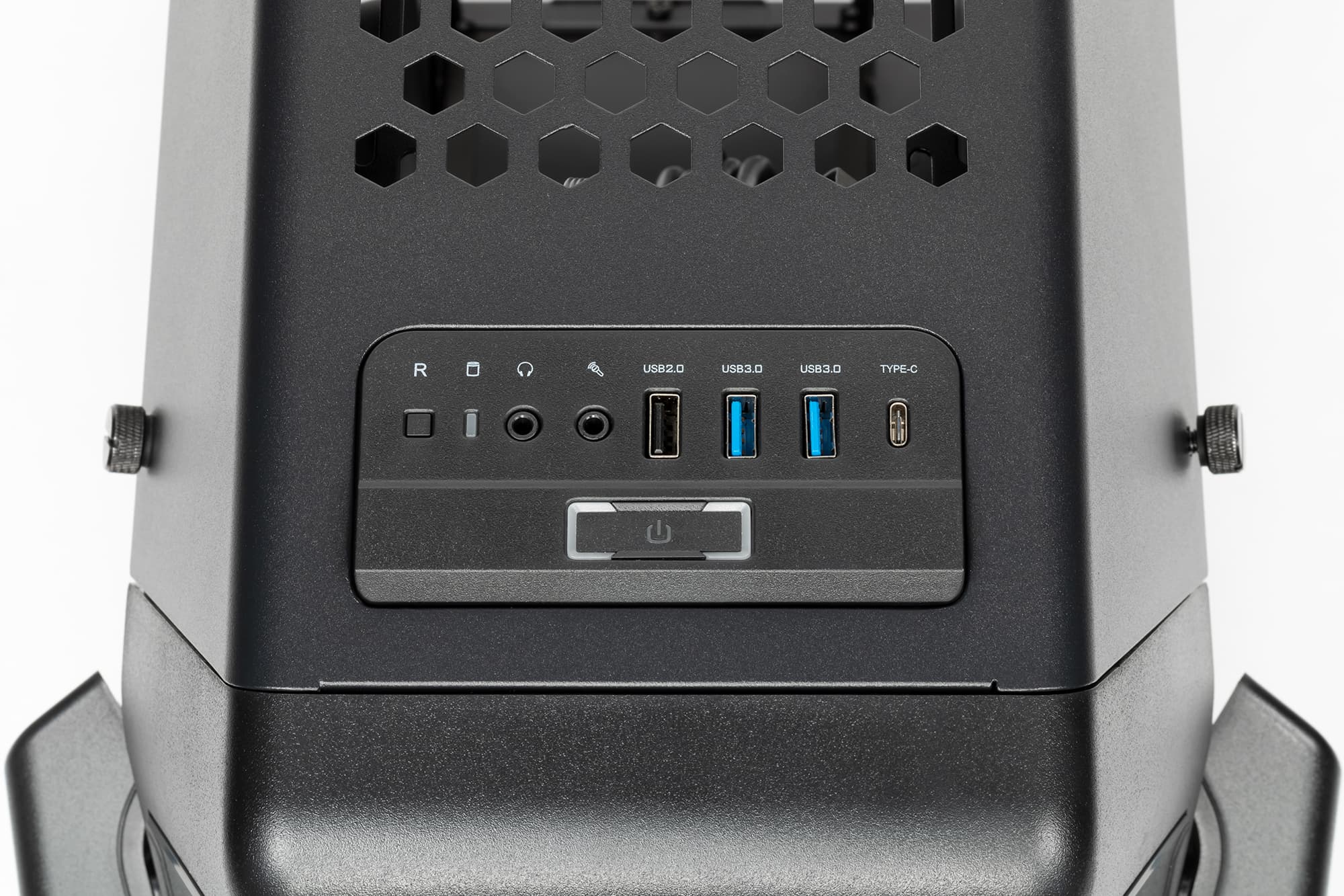 В передней части верхней панели размещены органы управления и коммутации. В их состав входят: два порта USB 3.0, один порт USB 2.0 и один USB 3.2 Gen 2 Type-C, а также стандартные разъемы для подключения микрофона и наушников, кнопка включения, кнопка перезагрузки.