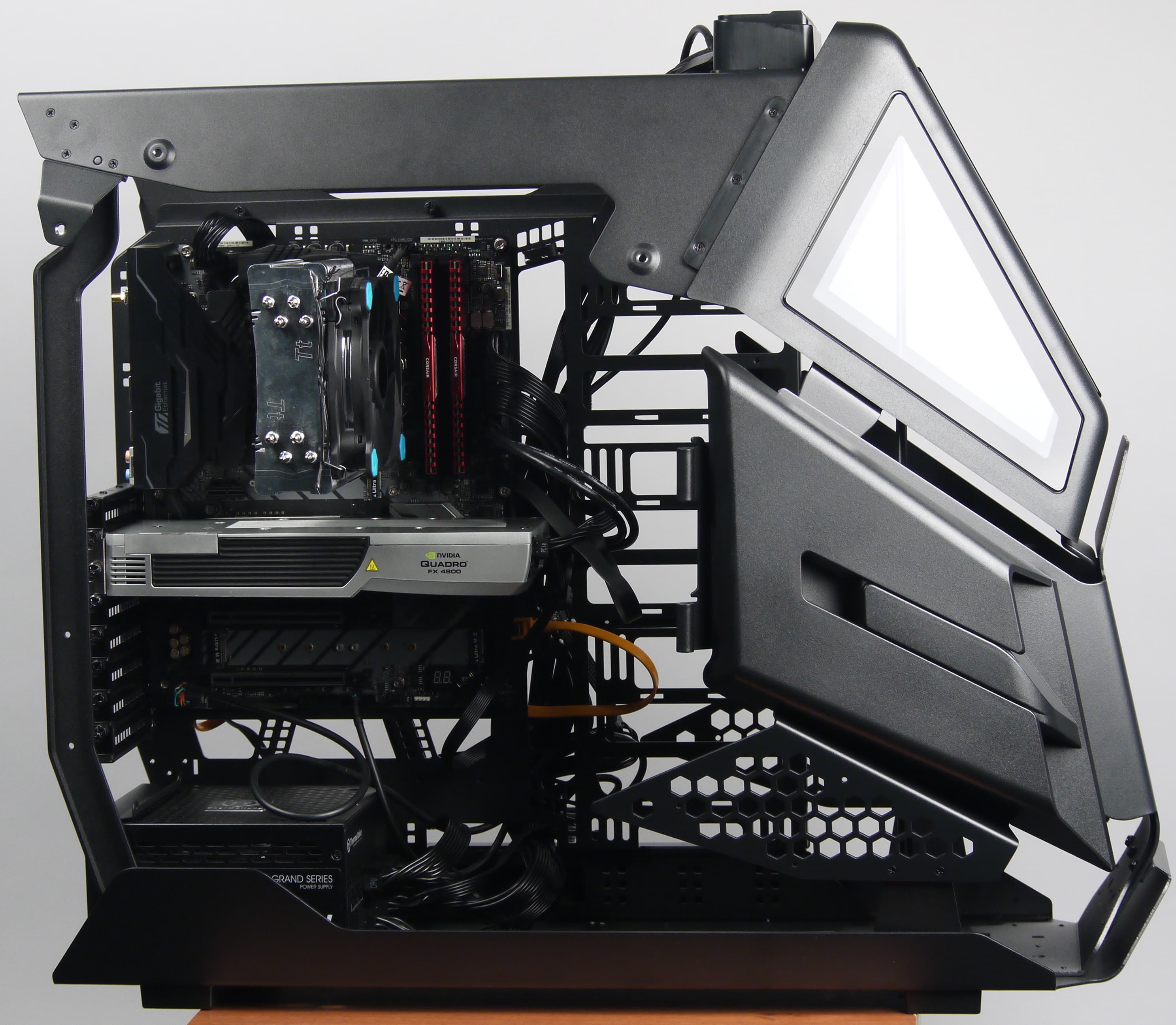 Процесс сборки системы в корпусе достаточно удобен, если вынести за скобки его габариты и вес. Нужно понимать, что масса пустого корпуса около 20 кг, а набор комплектующих увеличит это значение еще на 3-5 кг. В собранном корпусе нет никаких ручек, поэтому переносить его лучше со снятыми стенками. К тому же, так меньше шансов расколоть стеклянные элементы, поскольку окантовки у них тоже нет.