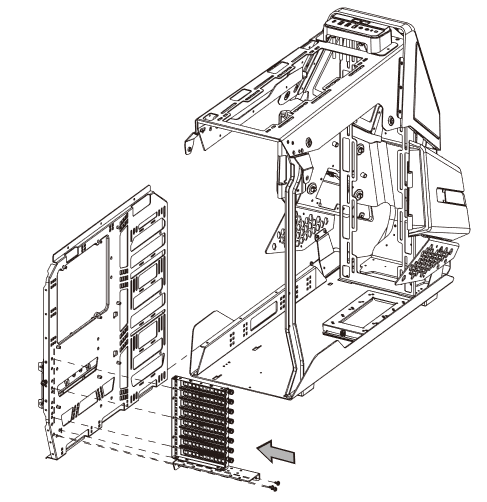 Шасси корпуса представляет собой платформу, на которую устанавливаются остальные детали. В первую очередь это основание для системной платы, которое тут выполнено съемным: для установки системной платы его нужно открутить и выдвинуть назад. С практической точки зрения, при первой сборке системы этого можно и не делать, так как корпус поставляется в частично разобранном состоянии и никаких препятствий к установке платы с кулером тут нет.