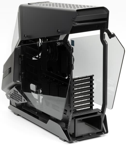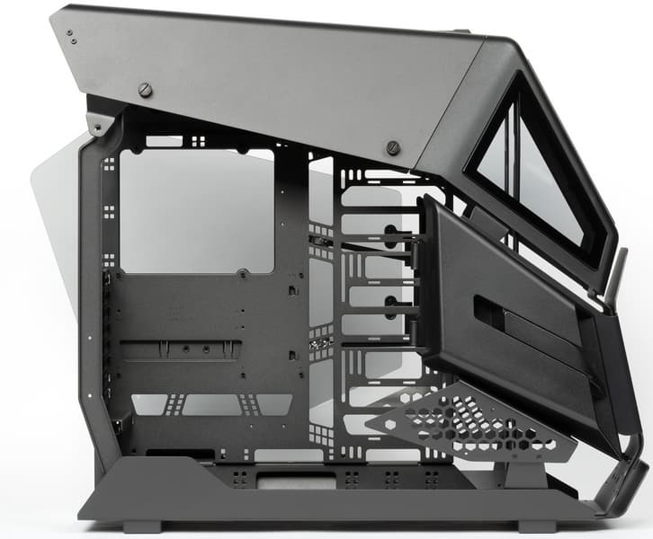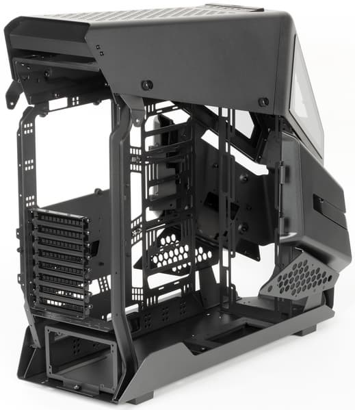 Данная модель позиционируется как решение open frame, что изначально подразумевает отсутствие внешних декоративных панелей, но тут эти панели все-таки есть, хотя большую их часть можно не устанавливать, на функционирование корпуса это никак не повлияет. А внешние панели выполняют по большей части именно декоративные функции, так как с учетом имеющихся отверстий никакого существенного влияния на охлаждение и шумоизоляцию их наличие не оказывает.