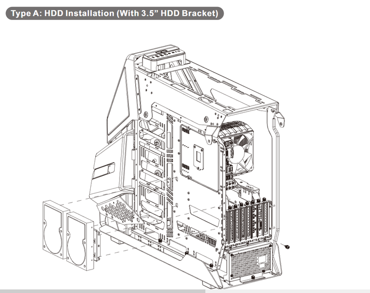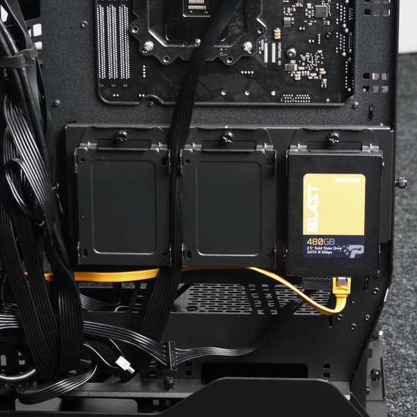 Установить блок питания тут можно только вентилятором вверх, так как днище под местом установки БП сплошное. В этом есть свои плюсы: не потребуется пылевой фильтр. К тому же, если БП оснащен подсветкой, то она будет подсвечивать внутренний объем корпуса. Длина проводов БП потребуется довольно значительная, лучше сразу брать модели с длиной проводов до разъема питания процессора от 65 сантиметров. Имеет смысл взять блок питания с модульными проводами, так как, в отличие от подавляющего большинства современных корпусов, тут блок питания остается вполне доступен и после его установки на посадочное место, добавлять/убирать провода будет удобно.