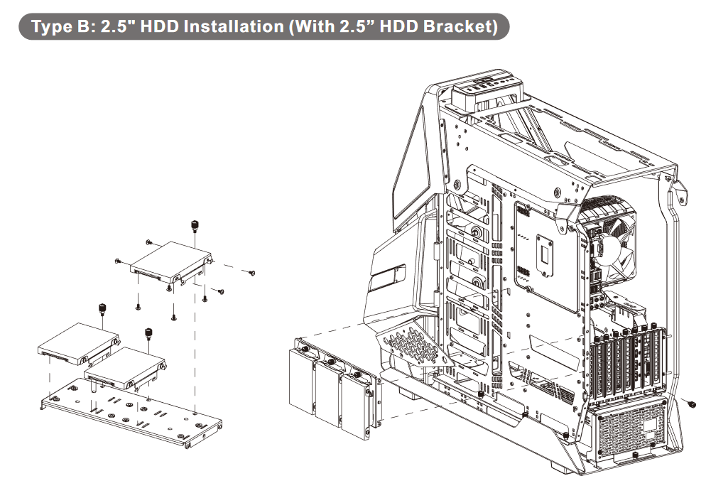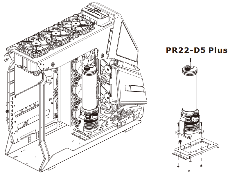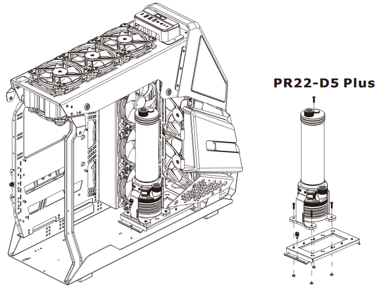 В корпусе предусмотрено штатное место для установки помпы СЖО на дискретных компонентах. Для этого предусмотрена съемная монтажная панель, устанавливаемая на днище корпуса. При определенной изобретательности на эту панель можно установить пару накопителей формата 2,5 дюйма.
