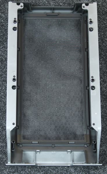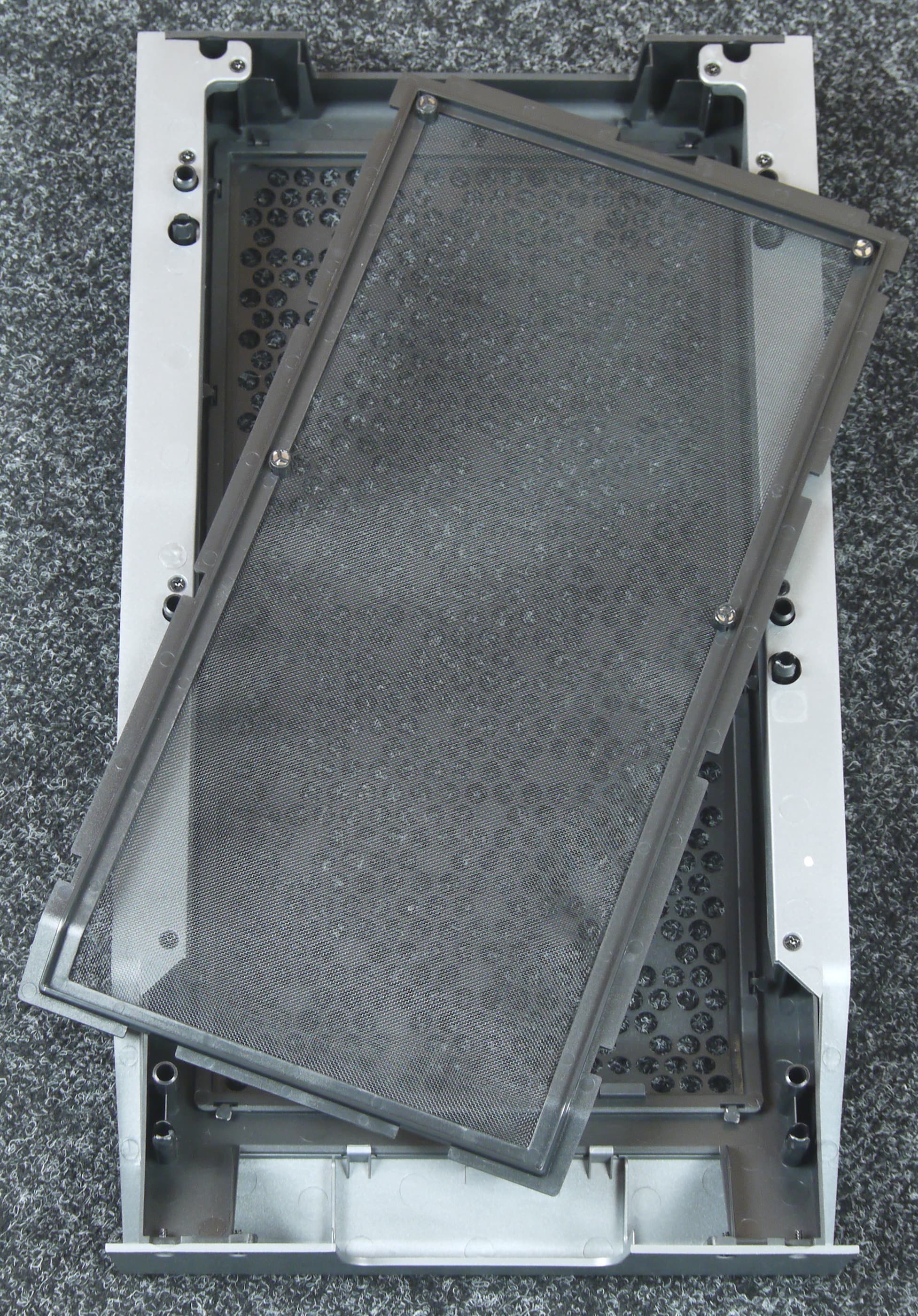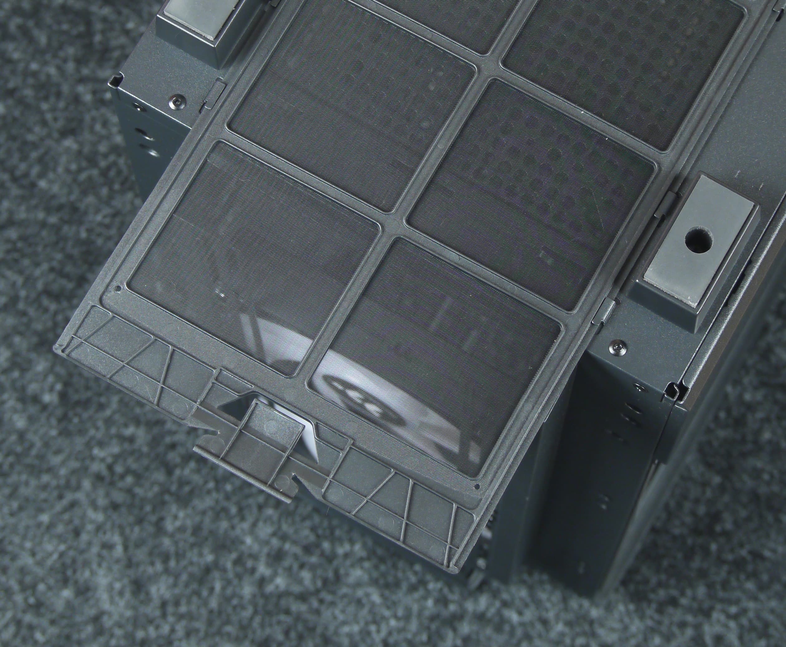 Предусмотрены фильтры, наиболее удобно обслуживать верхний — это пластиковая рамка с крупными круглыми отверстиями, изнутри оснащенная мелкоячеистой капроновой сеткой. Удерживается она на металле верхней плоскости шасси с помощью нескольких закрепленных по краям магнитов.