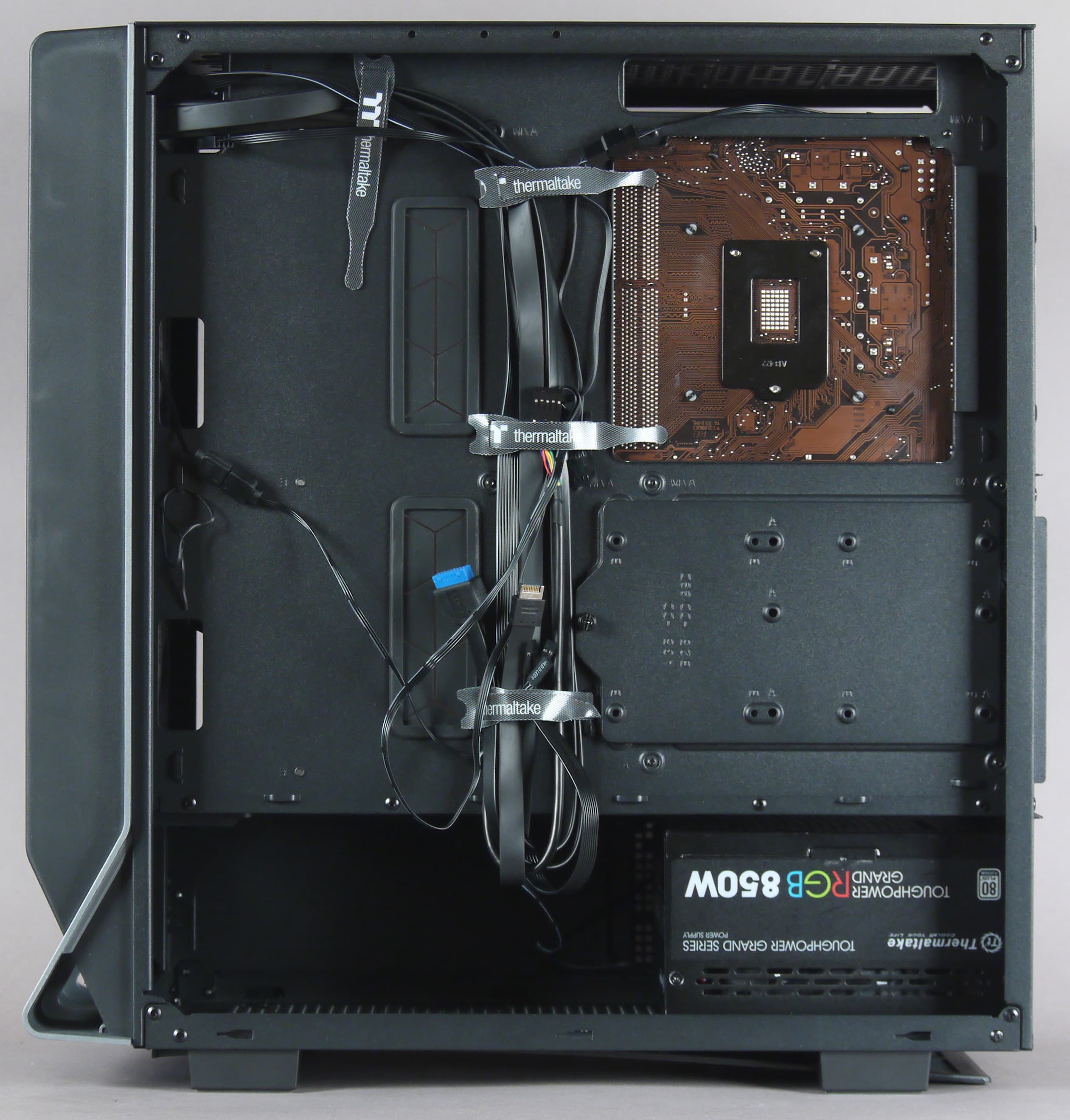 Между основанием для системной платы и правой боковой стенкой остается около 25 мм, чего вполне достаточно для прокладки кабелей. Для их аккуратного монтажа предусмотрены штампованные «ушки» и четыре многоразовые стяжки с «липучками», в комплекте есть и десяток одноразовых стяжек.