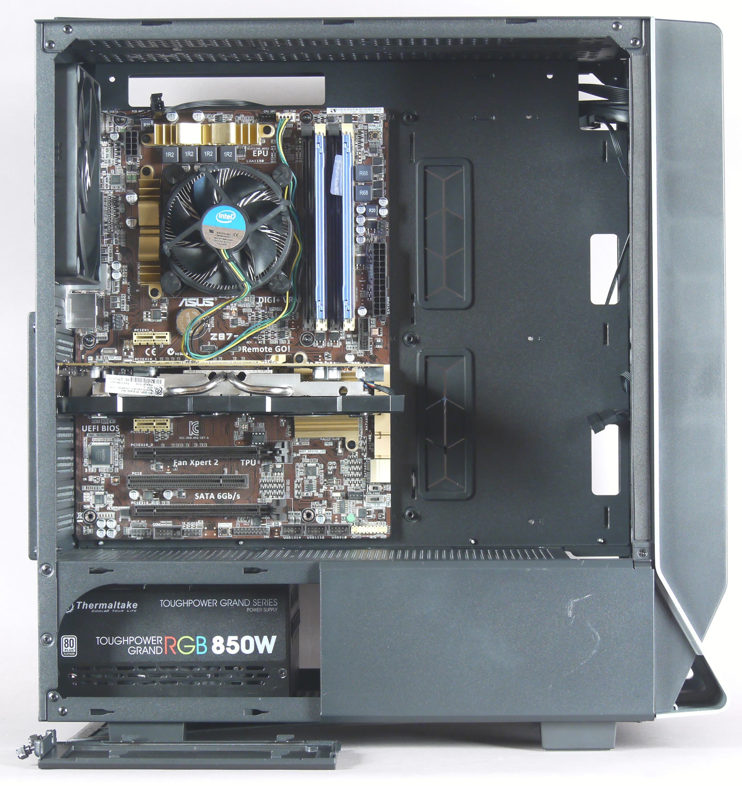 По высоте он разбит на два объема. В верхнем вертикально размещается системная плата форматом до E-ATX включительно (или до 330×305 мм) с платами расширения, в нижнем горизонтально устанавливается блок питания.