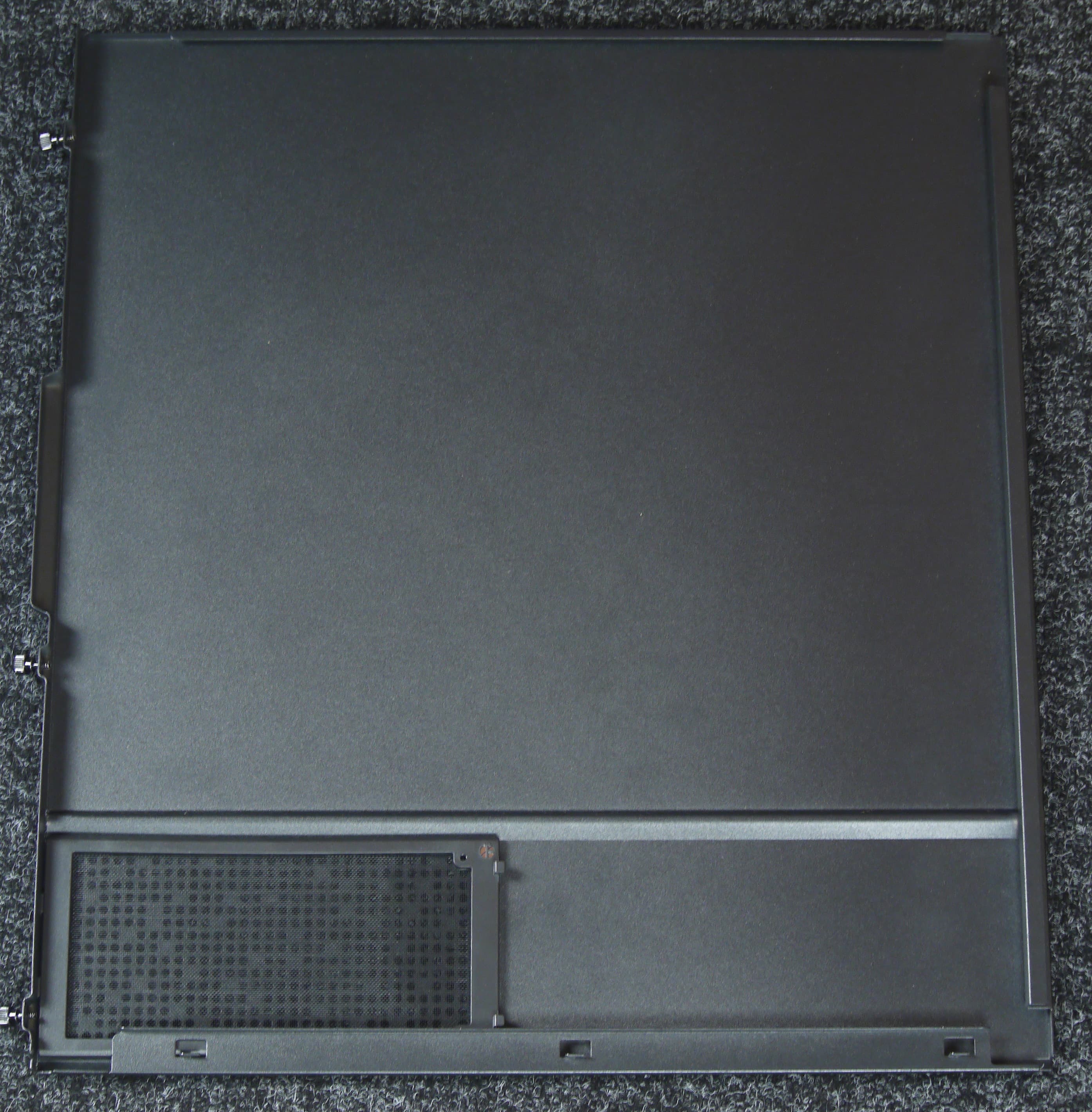 При этом нижний объем отделен от верхнего перегородкой, имеющей как небольшие вентиляционные отверстия, так и более крупные прорези для кабелей. Внизу наружная часть левой боковой плоскости состоит из двух небольших съемных крышек, остальное закрывает упомянутая выше стеклянная панель.