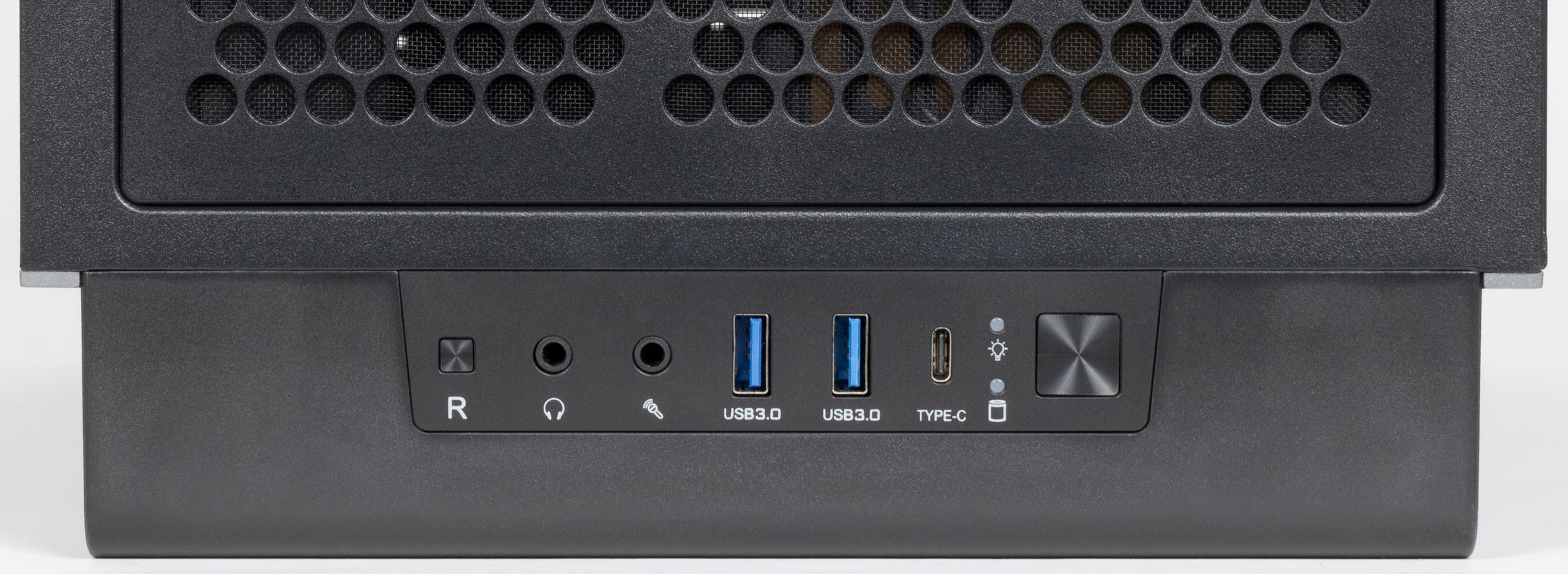 Интерфейсные разъемы и кнопки расположены на верхней плоскости шасси возле лицевой панели. Имеются два порта USB Type-A и один USB Type-C (конечно, тех и других хотелось бы иметь побольше, но для корпуса с умеренной ценой и это вполне нормально), отдельные разъемы для подключения микрофона и наушников, два индикатора — включения (белый) и дисковой активности (красный), небольшая кнопка перезагрузки, а также кнопка большего размера для включения. Усилие нажатия кнопок комфортное, свободный ход совсем небольшой, для Power нельзя исключить срабатывания от случайного прикосновения, а для Reset из-за ее размера подобное вряд ли возможно.