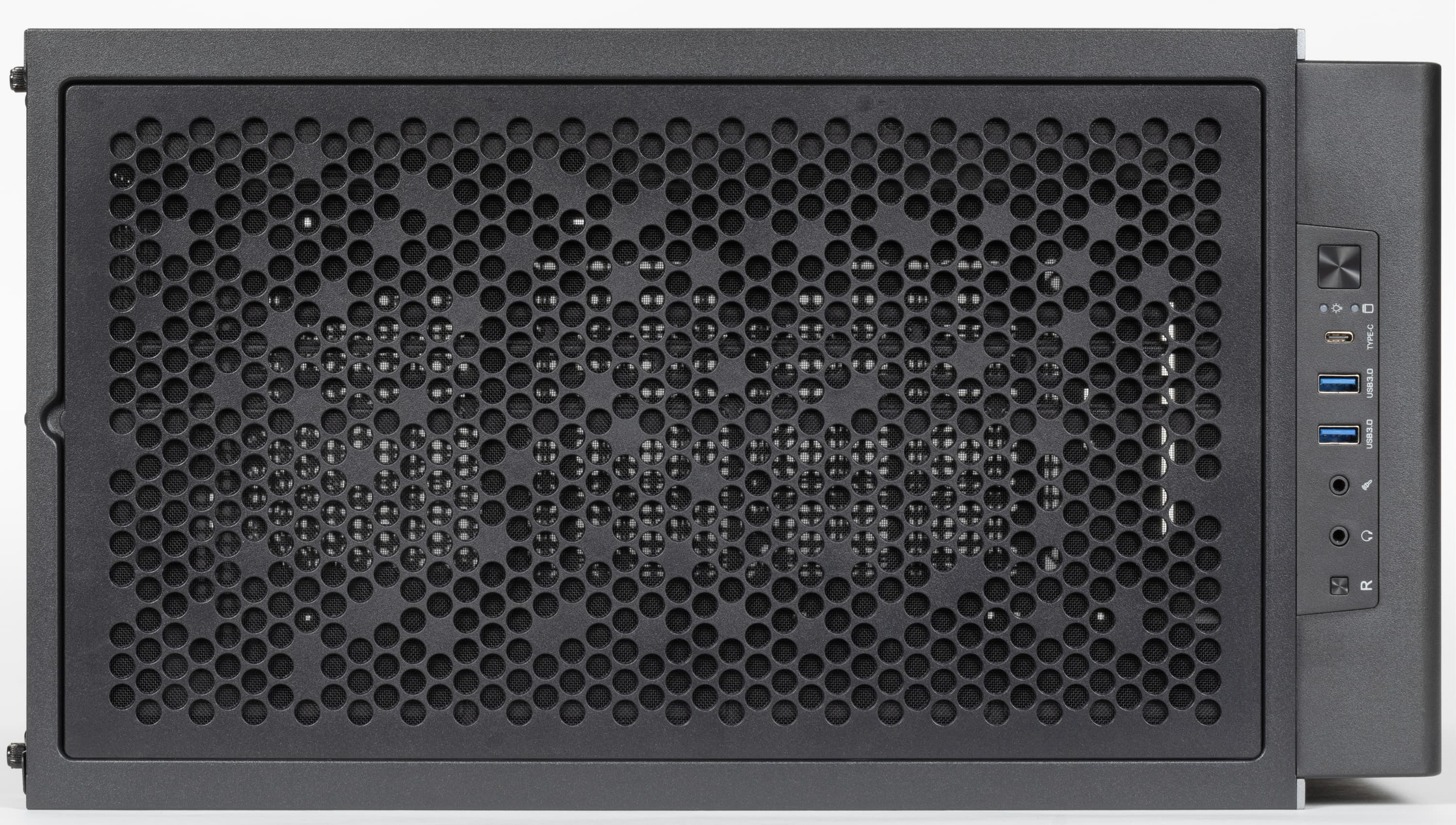 Левая боковая панель (она занимает примерно три четверти соответствующей плоскости корпуса) сделана цельностеклянной, с узкой черной непрозрачной рамкой на краях и тонировкой на остальной площади, что позволит использовать комплектующие с подсветкой. Разноцветные огни будут хорошо видны и через лицевую панель, которая почти целиком состоит из металлической сетки с крупными круглыми отверстиями.