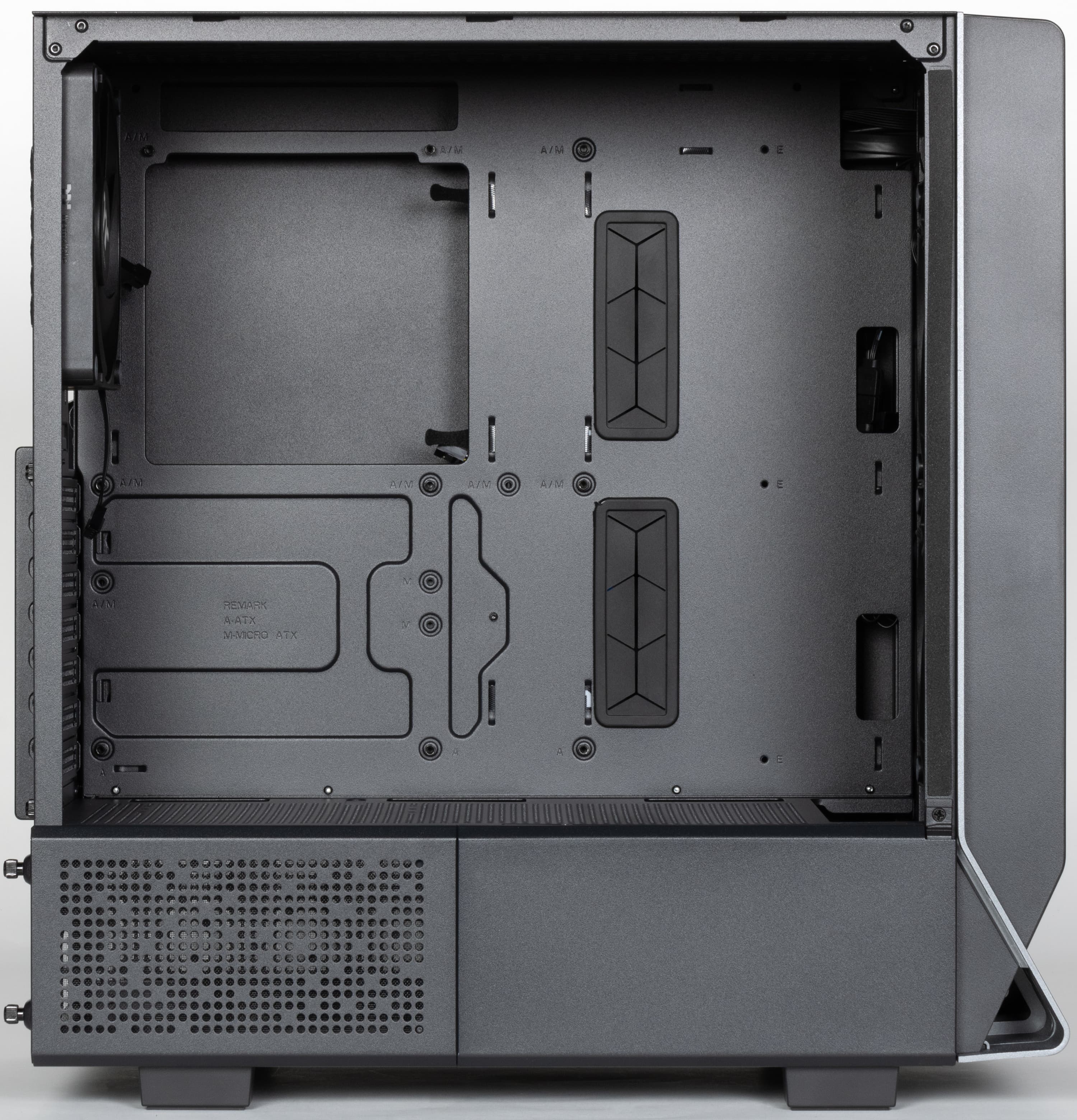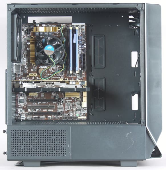 По данным производителя, можно использовать процессорный кулер высотой до 185 мм, реально расстояние от основания для системной платы до противоположной стенки 205 мм, но из него нужно вычесть высоту стоек для монтажа платы (в данном случае 6 мм) и толщину самой платы с установленным процессором. Имеющееся в этом основании большое окно обеспечит доступ к креплению кулера без снятия платы, а для прокладки кабелей имеются прорези, две самые большие из которых закрыты резиновыми вставками с разрезными лепестками.