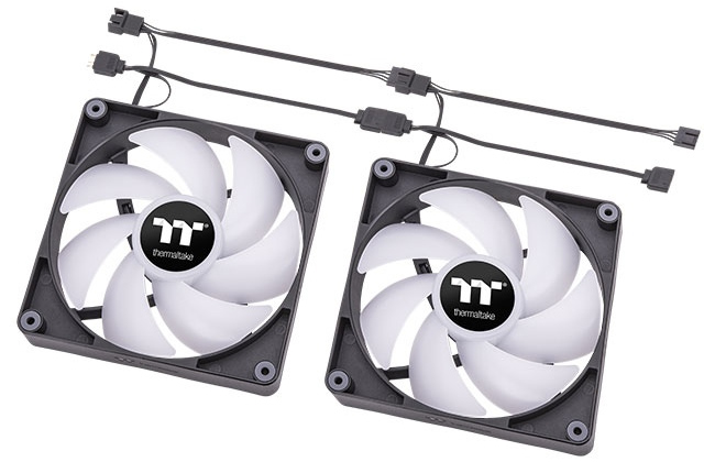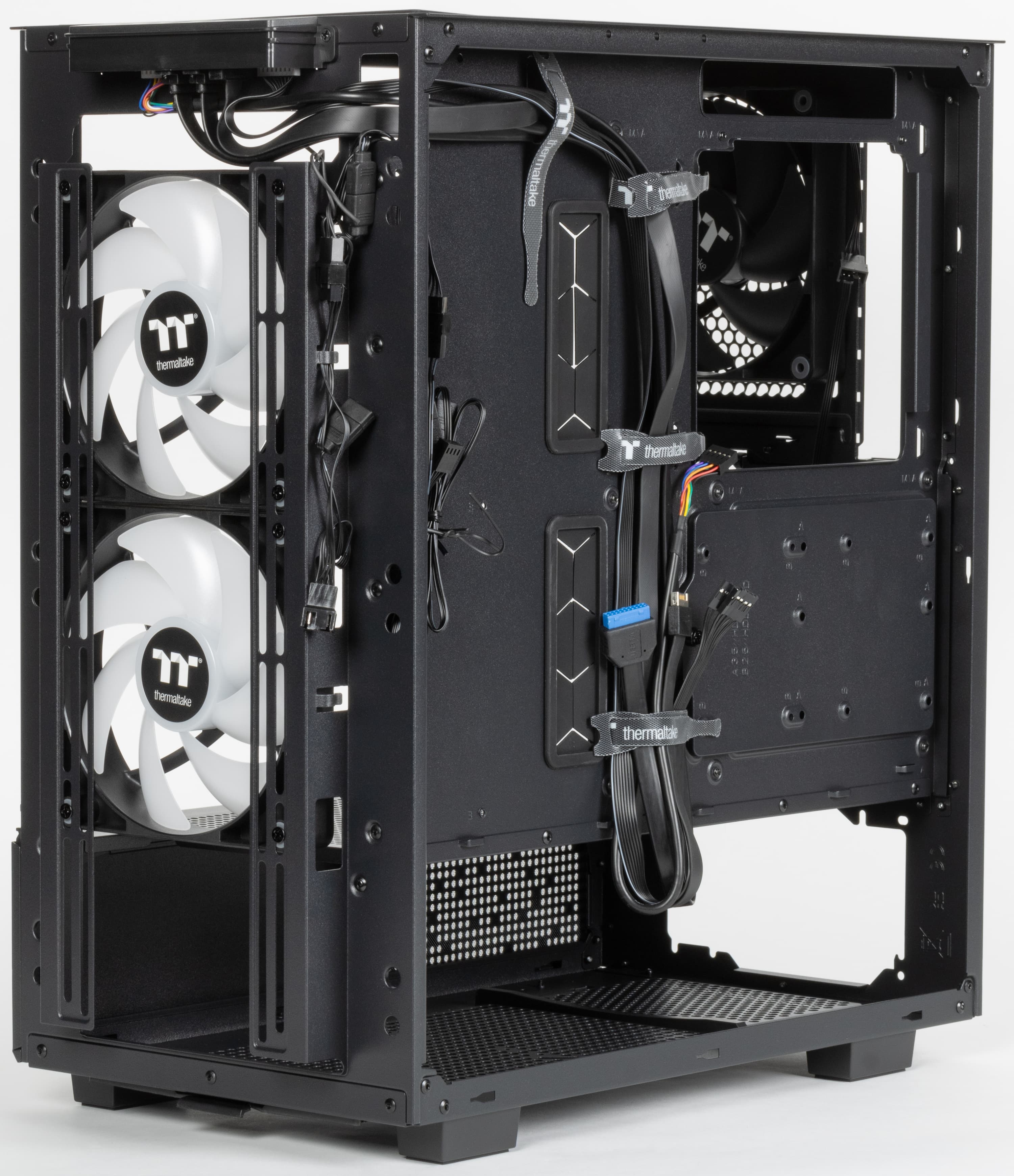 Штатно предустановлены три 140-миллиметровых вентилятора собственного производства. Два фронтальных нагнетающих CT140 ARGB (12 В, 0,3 А) имеют подсветку с индивидуальной адресацией светодиодов и ШИМ-управление скоростью вращения, еще один CT140 без подсветки установлен сзади как вытяжной. Разъемы для подключения двух типов: стандартные четырехконтактные для ШИМ и трехконтактные ARGB для подсветки, предусмотрено сквозное подключение. В местах крепления у вентиляторов имеются силиконовые амортизирующие прокладки.