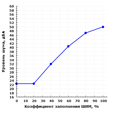 При измерении шума на расстоянии 0,35 м от передней панели, что в нашем случае близко по условиям к настольному размещению корпуса, его значение изменялось от очень низкого (22,5 дБА) до очень высокого (50 дБА) уровня для жилого помещения в дневное время суток.