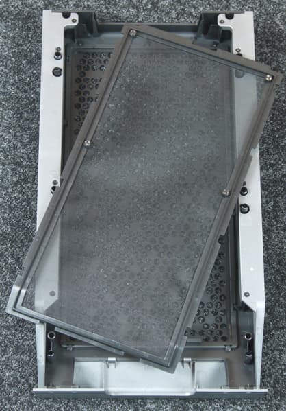 Нижняя часть левой боковой поверхности корпуса, находящаяся ниже стеклянной крышки, состоит из двух частей. Про заднюю мы уже говорили, передняя крепится двумя винтами с потайными головками изнутри корпуса, снимать ее придется для установки упоминавшейся выше опциональной панели с ЖК-экраном.