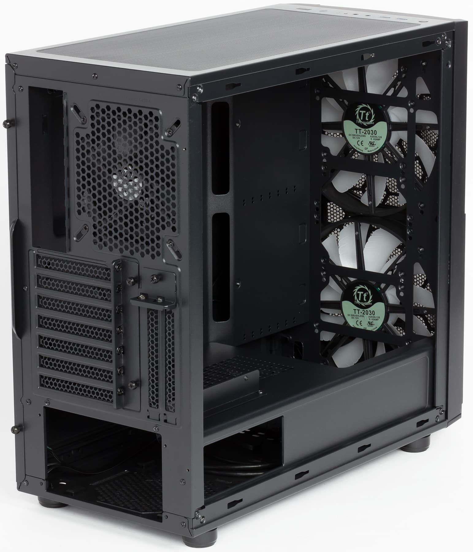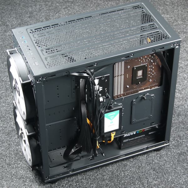 В корпусе предусмотрена возможность установки вентиляторов типоразмера 120, 140 и 200 мм. Посадочные места для них имеются спереди, сверху и сзади. Самые большие вентиляторы можно установить только спереди.