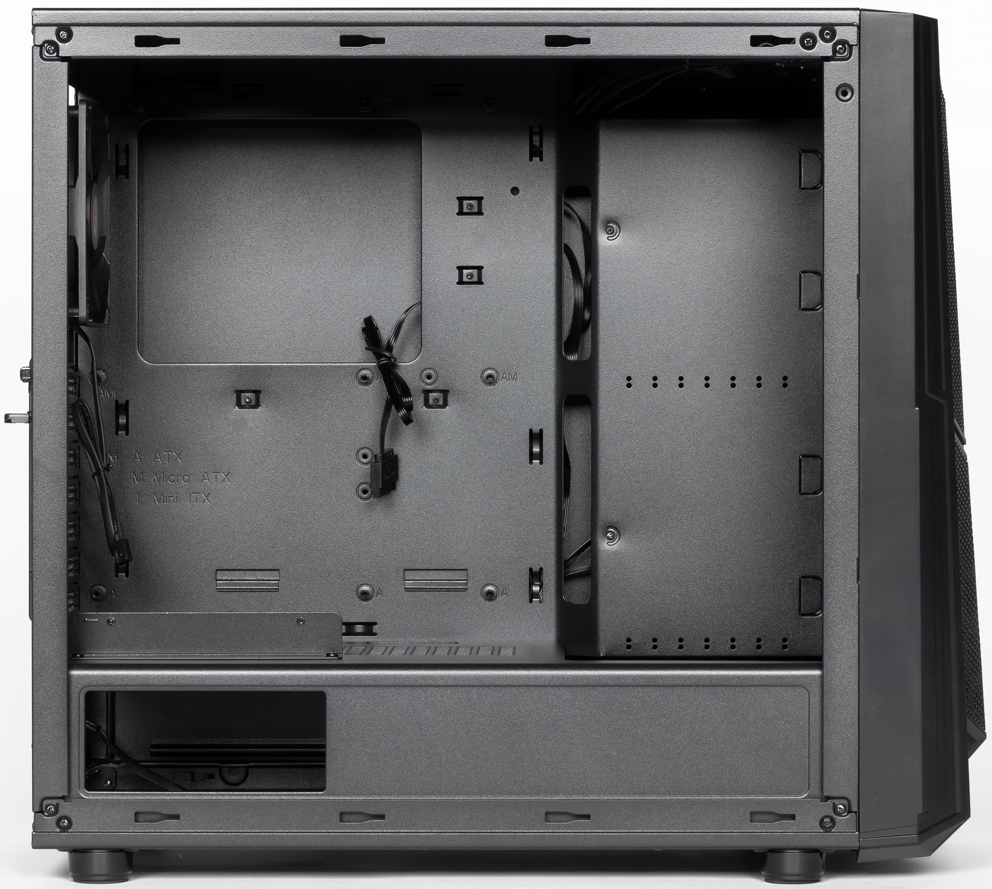 Вторая боковая стенка представляет собой стальную панель с обычной пазогребенной системой, как в дешевых корпусах. Ее крепление осуществляется двумя винтами с накатной головкой.