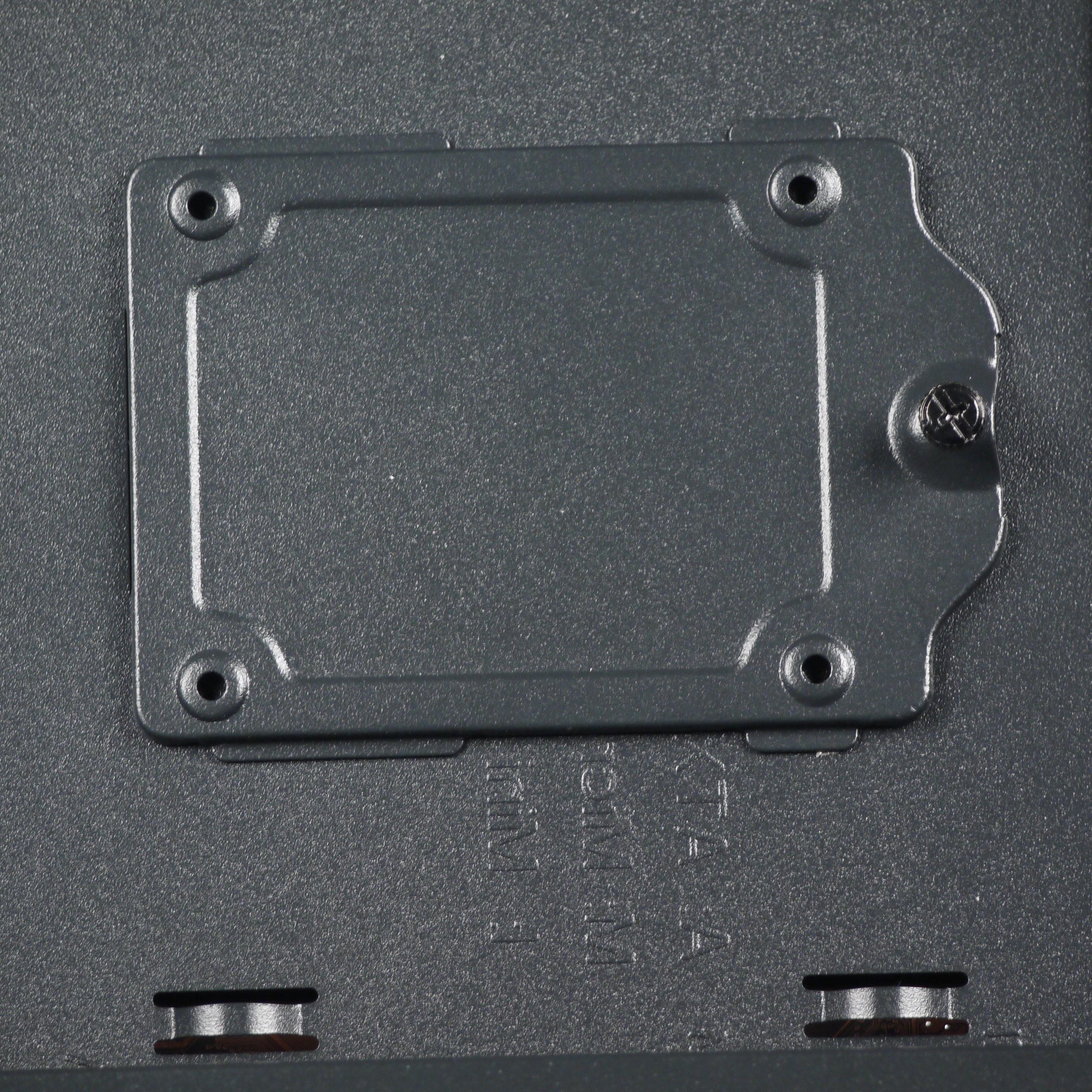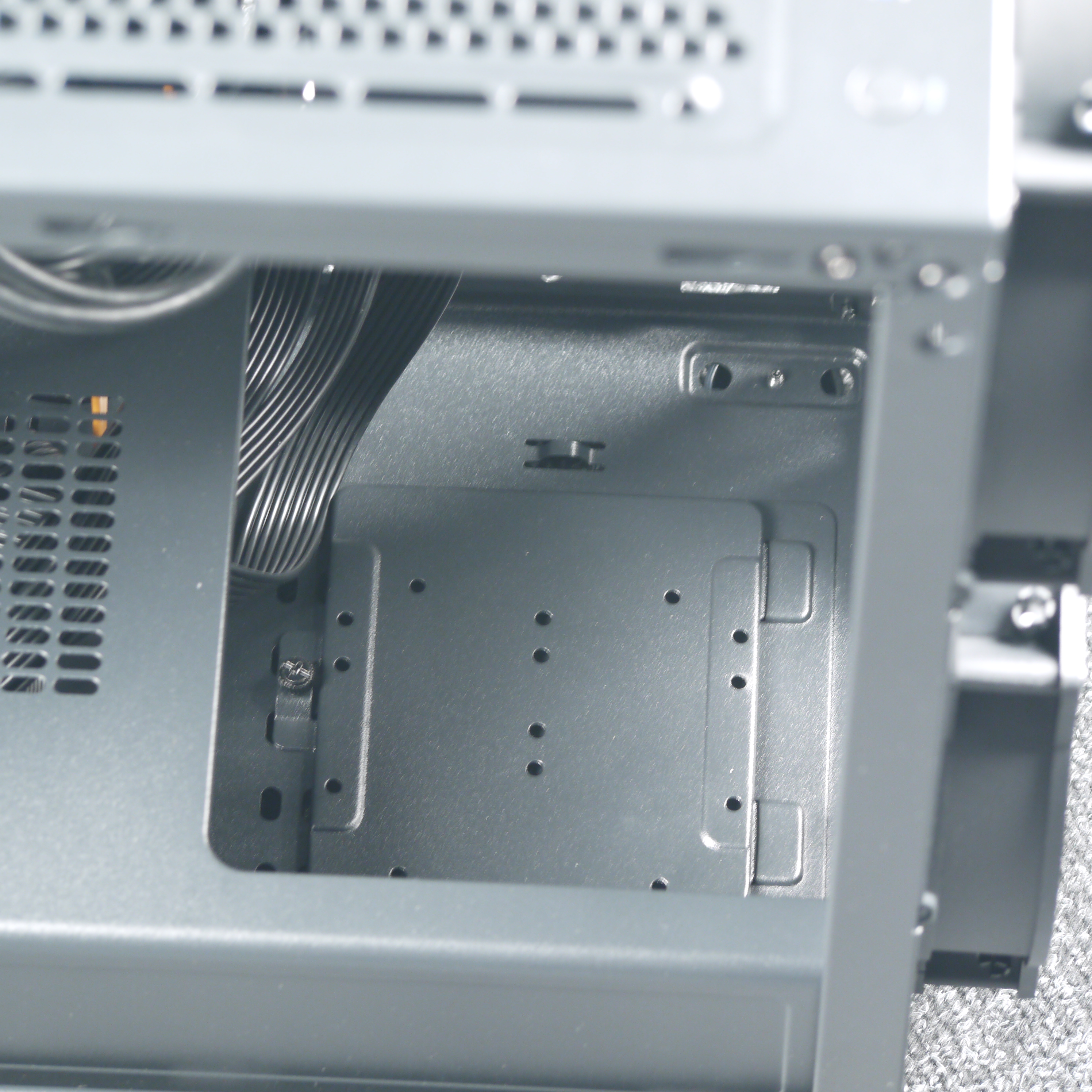 Дополнительно на обратной стороне основания для системной платы предусмотрены два посадочных места для накопителей формата 2,5 дюйма. Крепление каждого накопителя осуществляется на съемную стальную пластину, которая фиксируется одним винтом с накатной головкой. Никакой амортизации не предусмотрено.