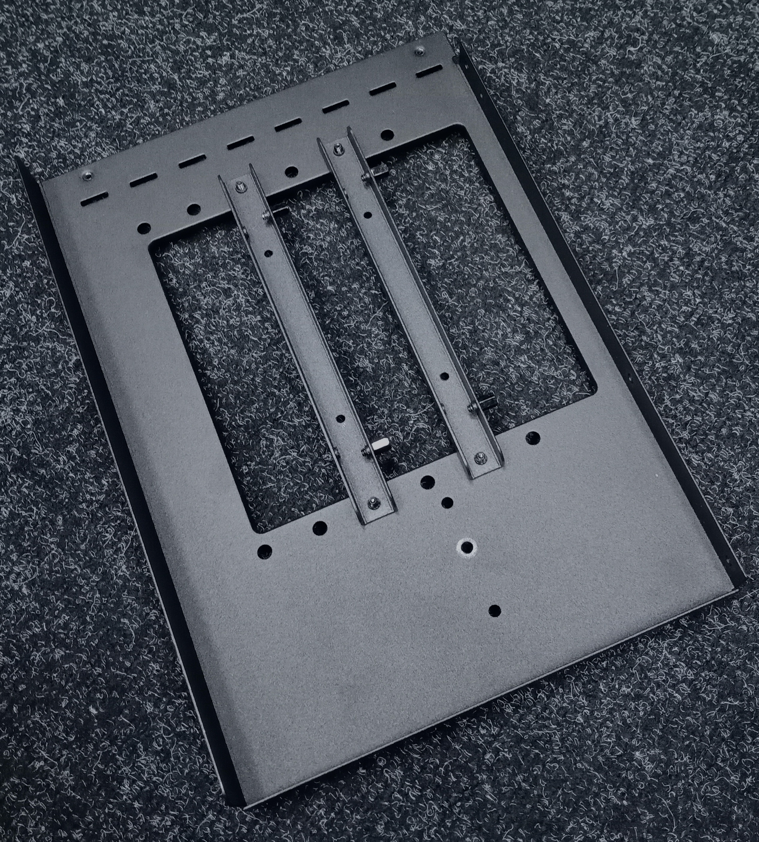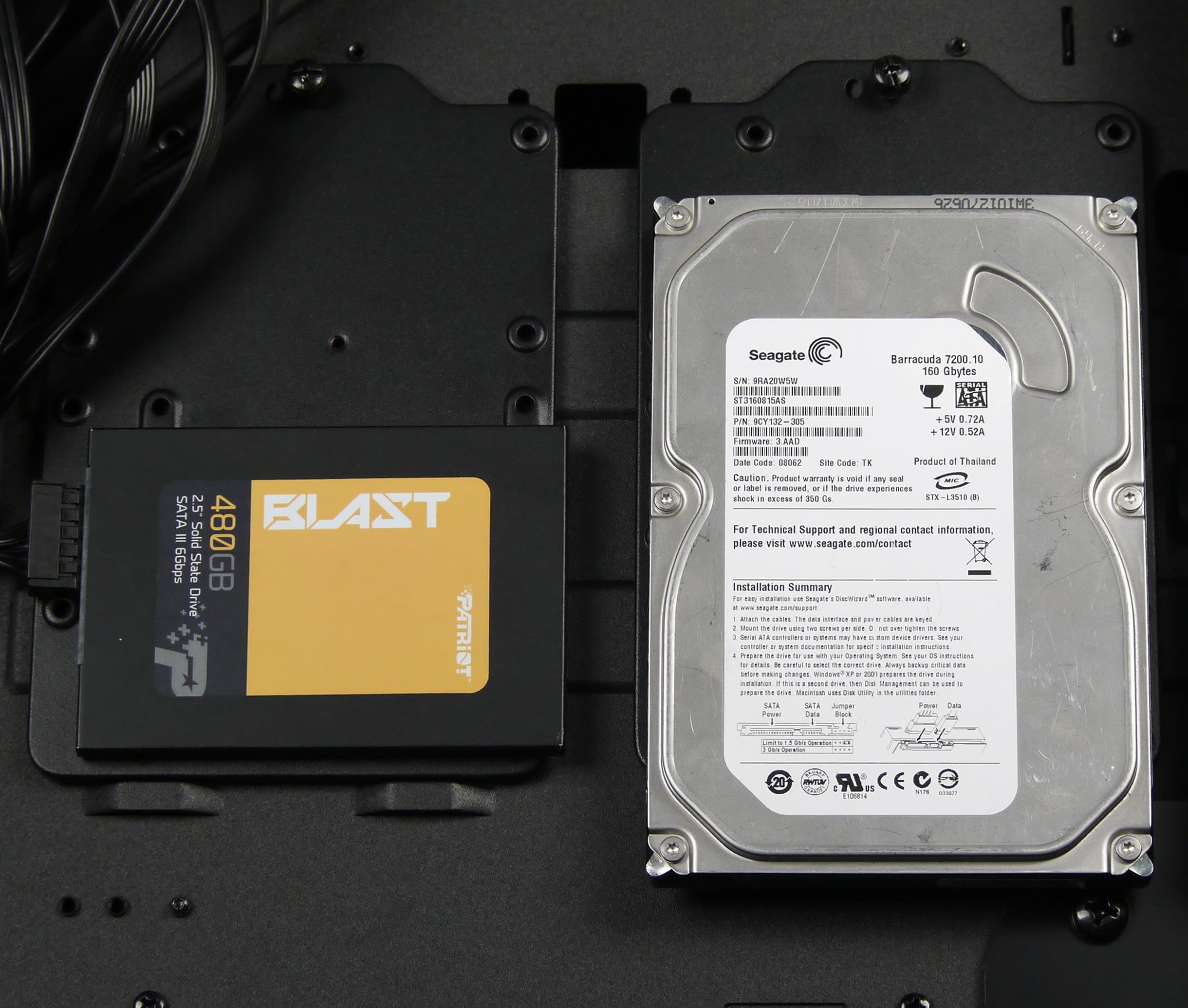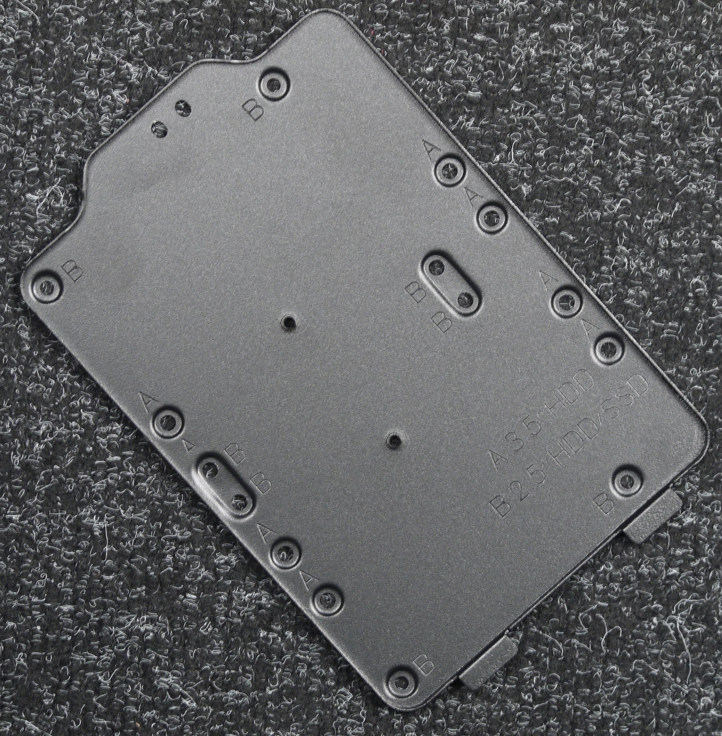 Для накопителей предусмотрены три быстросъемных монтажных пластины, которые установлены на обратной стороне основания для системной платы. Их крепление осуществляется за счет монтажных отверстий, которые цепляются за пару выступов. Пластины дополнительно фиксируются винтами с накатной головкой.