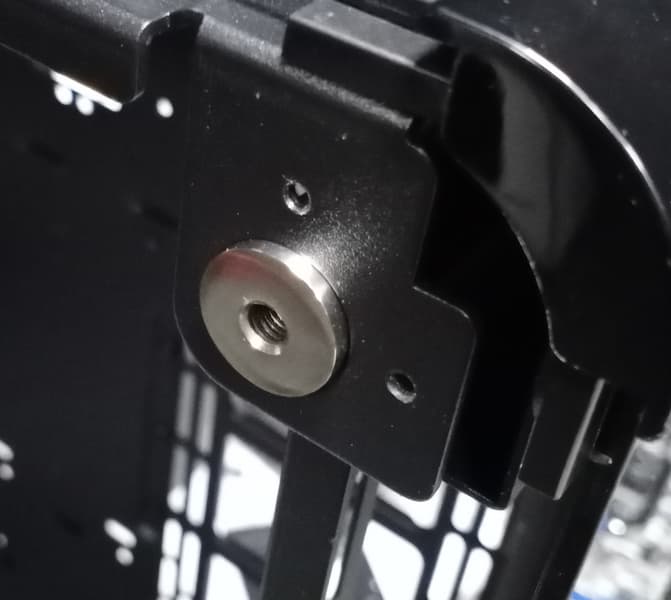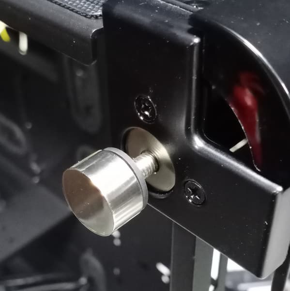 Винты вкручиваются в детали цилиндрической формы, внутри которых имеется резьба. С обратной стороны данные детали прикручены к основанию системной платы также при помощи винтов. Именно из-за данного технического решения жесткость корпуса, особенно со снятыми боковыми стенками, не очень высокая.