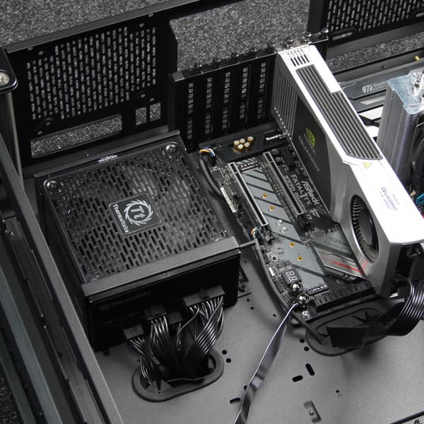 С точки зрения размещения компонентов внутри корпуса тут все довольно близко к современным типовым решениях, но есть некоторые особенности: блок питания размещен снизу, но вертикально и на отдельном кронштейне, который фиксируется на основании для системной платы. Системная плата расположена вертикально, видеокарту можно установить в двух положениях: перпендикулярно системной плате или параллельно. Во втором случае потребуется райзер, который в комплект поставки ожидаемо не входит.