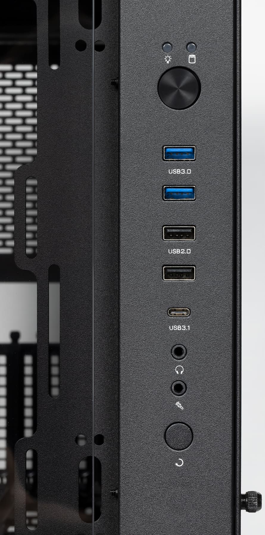 В правой части передней панели размещены органы управления и коммутации: два порта USB 3.0, два порта USB 2.0 и один USB 3.1 Gen 2 Type-C, а также стандартные разъемы для подключения микрофона и наушников, кнопка включения, кнопка перезагрузки.