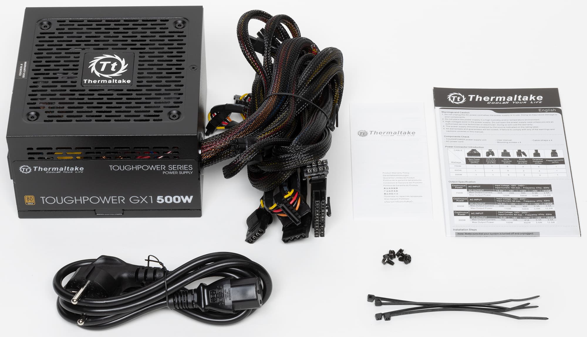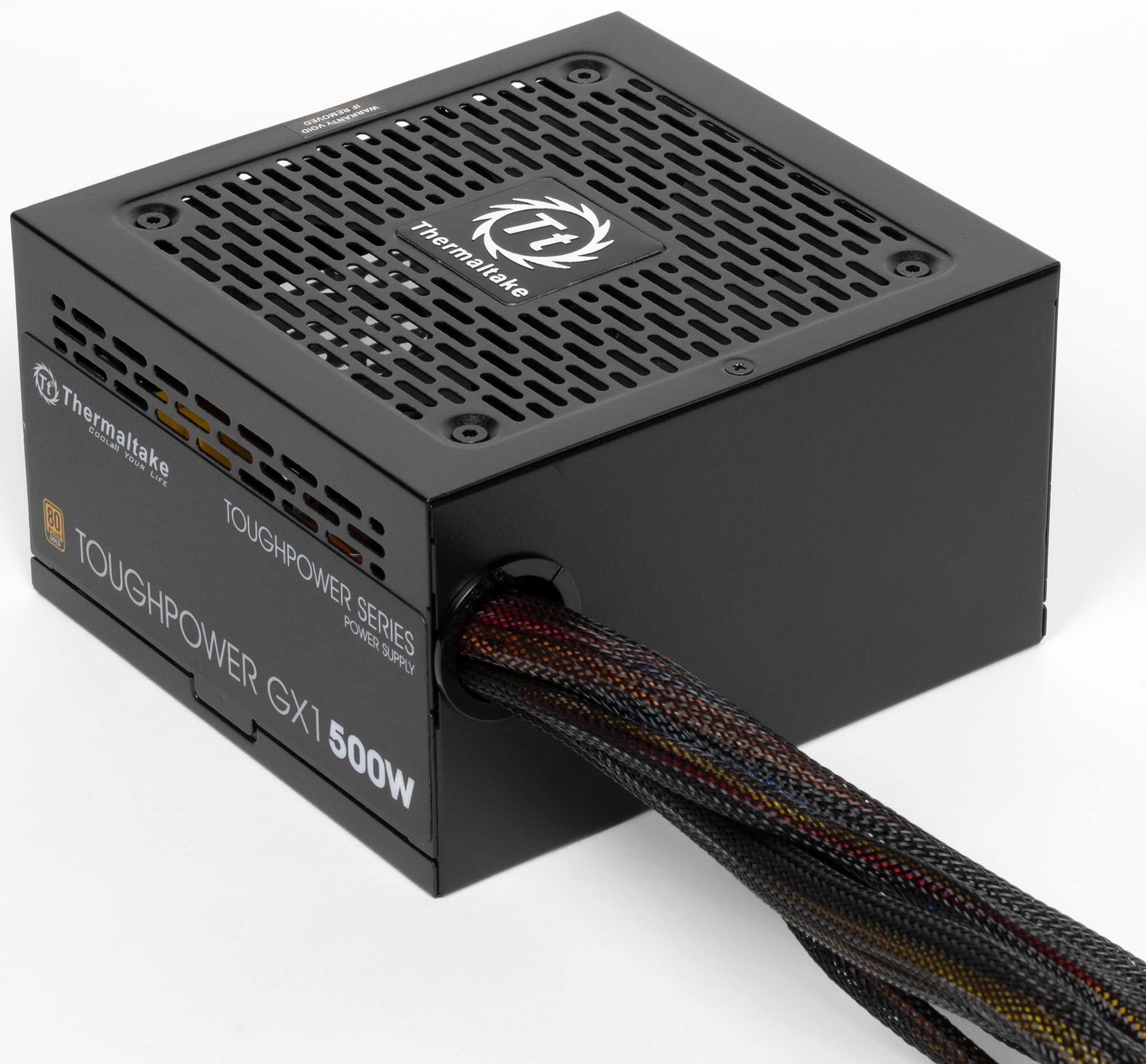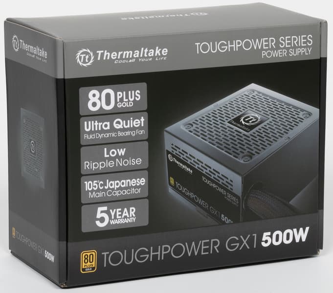 В серии Toughpower GX1 компании Thermaltake представлены три модели мощностью 500, 600 и 700 Вт. В нашем распоряжении оказалась младшая модель. Данная серия позиционируется производителем в качестве доступного решения для геймеров. В качестве ключевых особенностей названы наличие сертификата 80Plus Gold и длина корпуса 140 мм, а также основной (высоковольтный) конденсатор японского происхождения.