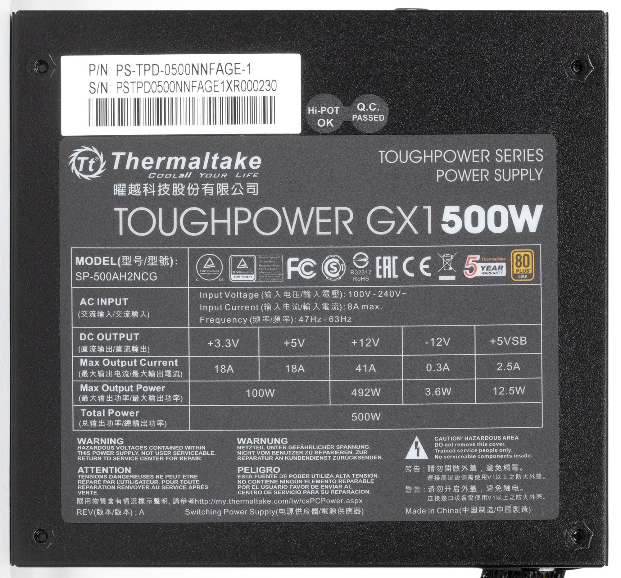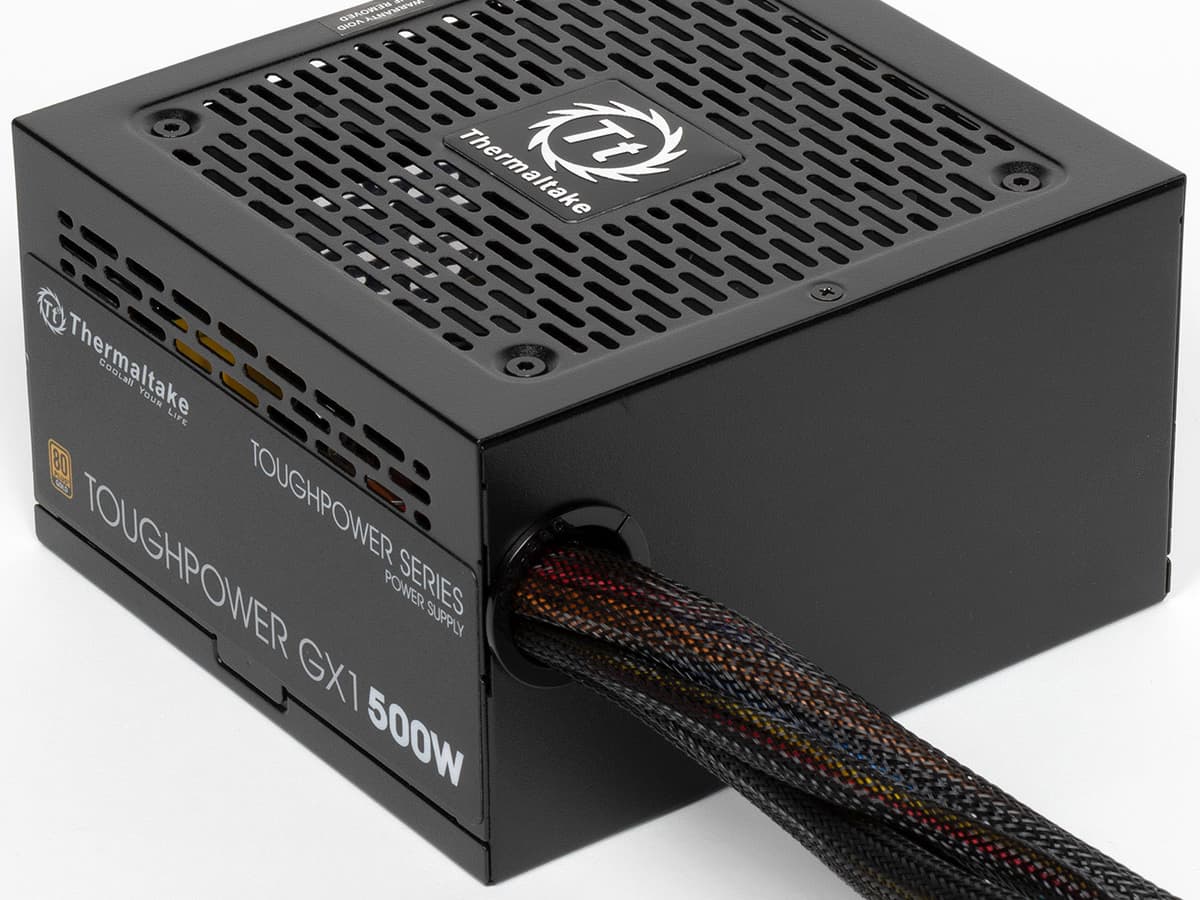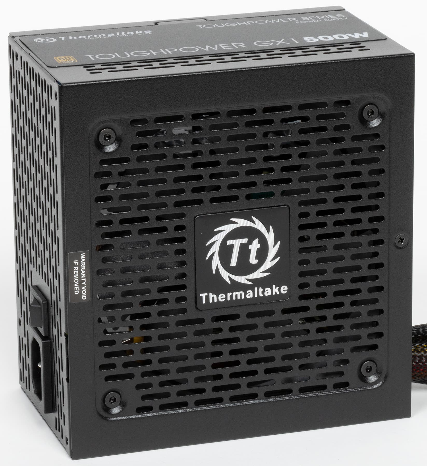 В серии Toughpower GX1 компании Thermaltake представлены три модели мощностью 500, 600 и 700 Вт. В нашем распоряжении оказалась младшая модель. Данная серия позиционируется производителем в качестве доступного решения для геймеров. В качестве ключевых особенностей названы наличие сертификата 80Plus Gold и длина корпуса 140 мм, а также основной (высоковольтный) конденсатор японского происхождения.