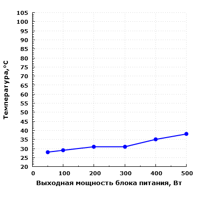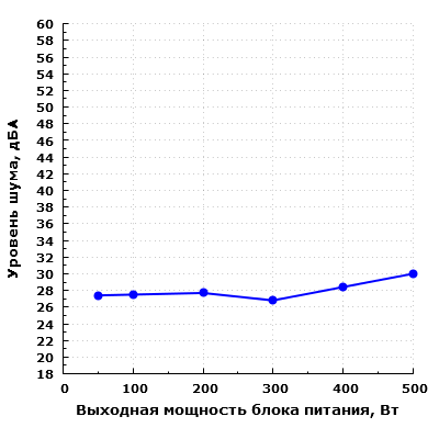 Шум блока питания находится на сравнительно низком уровне (ниже среднетипичного) при работе на мощности до максимальной (500 Вт) включительно. Такой шум будет малозаметен на фоне типичного фонового шума в помещении в дневное время суток, особенно при эксплуатации данного блока питания в системах, не имеющих какой-либо звукошумовой оптимизации. В типичных бытовых условиях большинство пользователей оценивает устройства с подобной акустической эргономикой как относительно тихие.