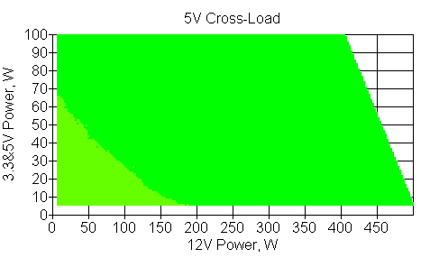 Следующим этапом инструментального тестирования является построение кросснагрузочной характеристики (КНХ) и представление ее на четвертьплоскости, ограниченной максимальной мощностью по шине 3,3&5 В с одной стороны (по оси ординат) и максимальной мощностью по шине 12 В с другой (по оси абсцисс). В каждой точке измеренное значение напряжения обозначается цветовым маркером в зависимости от отклонения от номинального значения.
