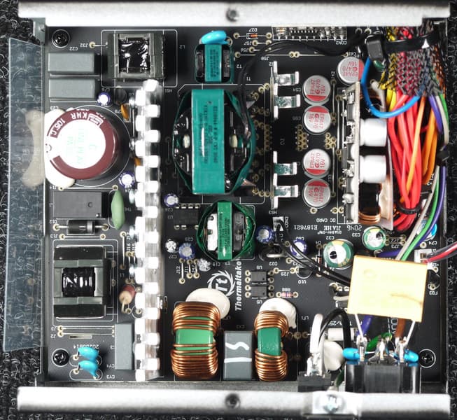 Высоковольтные силовые элементы, включая входную диодную сборку, установлены на одном радиаторе. Транзисторы синхронного выпрямителя установлены с оборотной стороны основной печатной платы, а с лицевой стороны имеются теплорассеиватели. Элементы импульсных преобразователей каналов +3.3VDC и +5VDC размещены на дочерней печатной плате, установленной вертикально, и, по традиции, дополнительных теплоотводов не имеют — это вполне типично для блоков питания с активным охлаждением.
